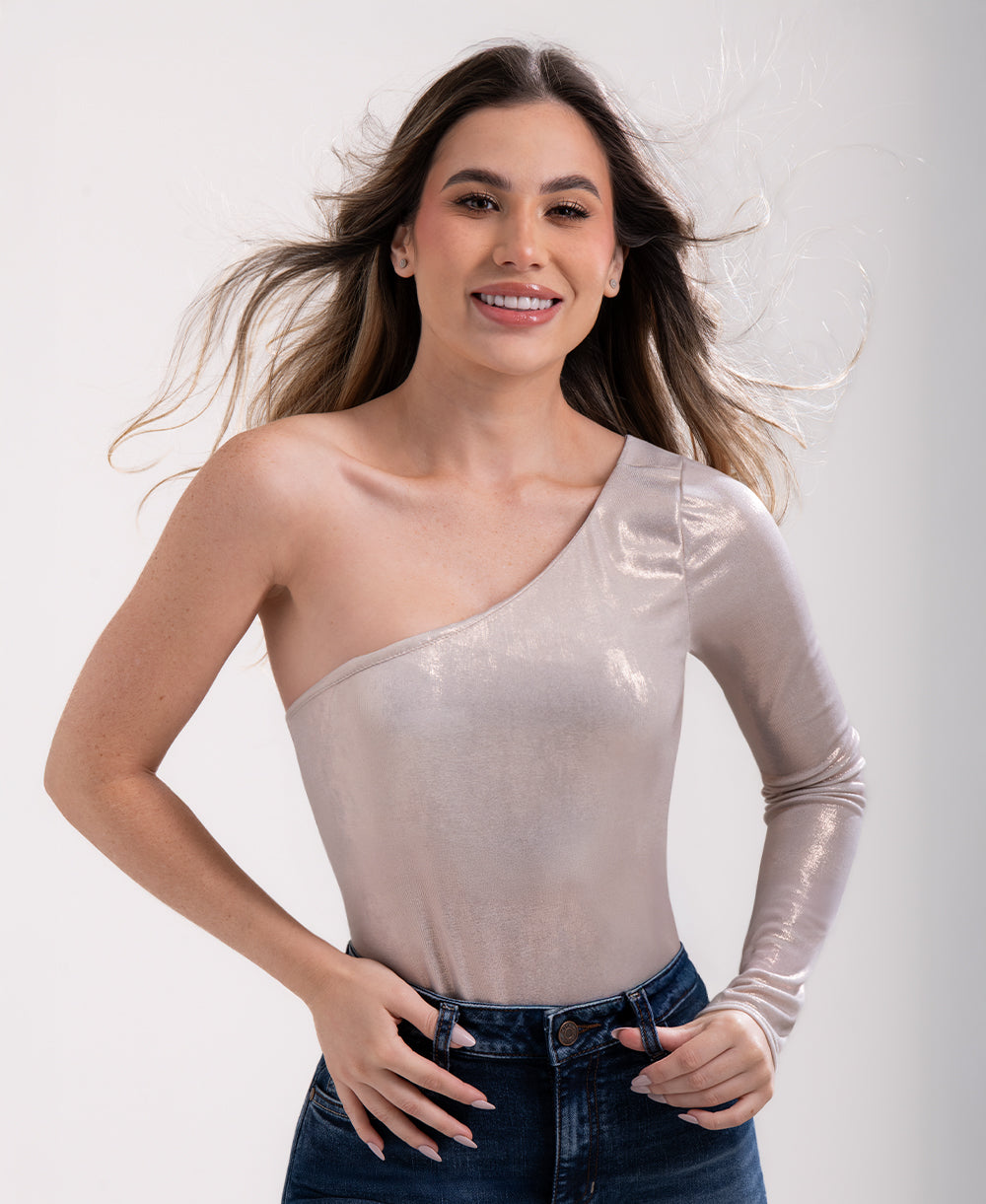 Blusa de diseño asimétrico con un solo hombro y manga larga, confeccionada en tela suave con acabado satinado que aporta un brillo elegante y sofisticado. Su silueta ajustada realza la figura, mientras el escote diagonal le da un toque moderno y femenino. Ideal para looks de noche o para elevar outfits casuales con jeans o pantalones de tiro alto. Una prenda versátil que combina glamour y comodidad en una sola pieza.