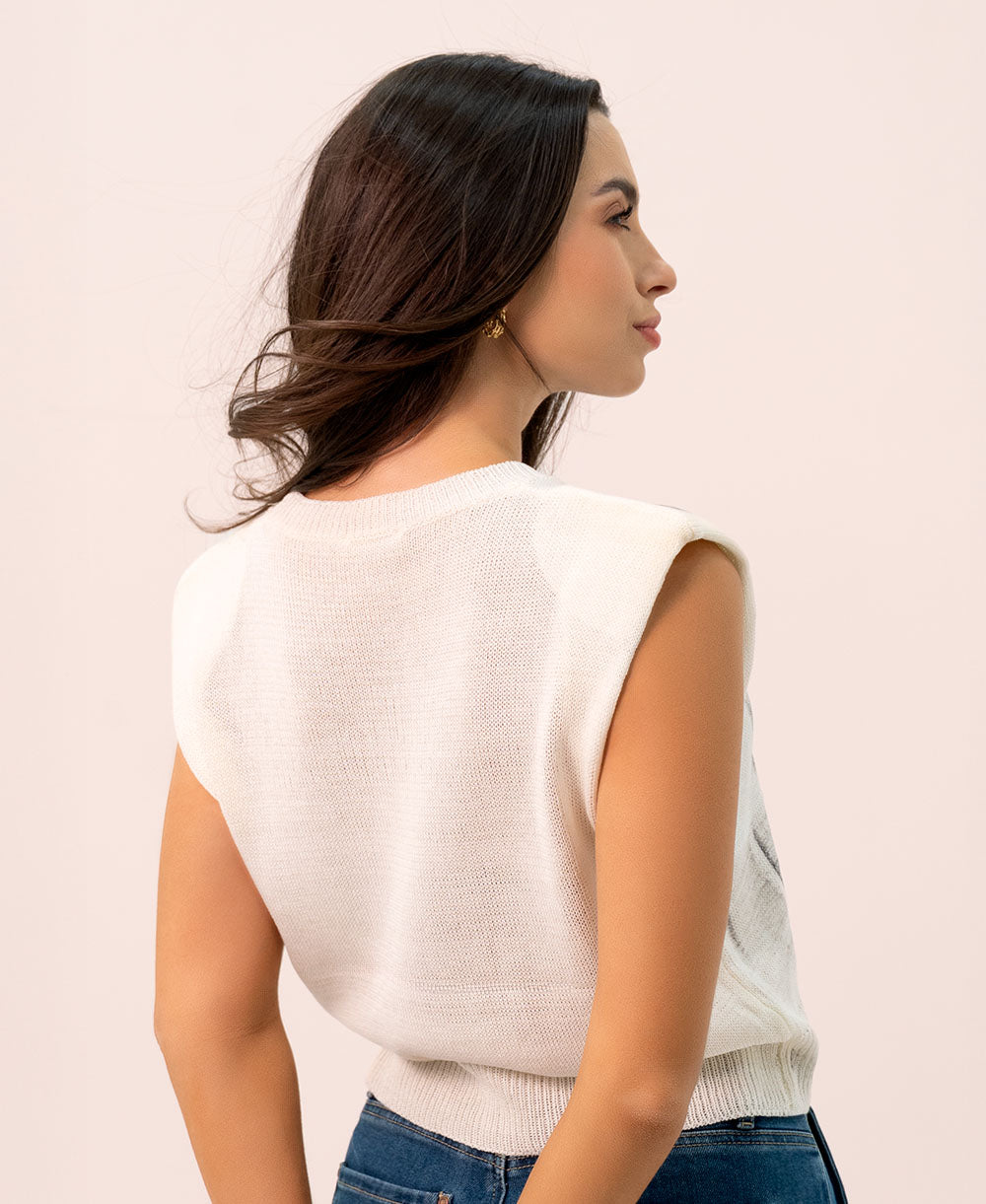 Blusa Blanca manga sisa tejida, elaborado en un punto liviano de tacto suave, destaca por su diseño contemporáneo con acabado desgastado tipo brochazo que aporta un toque urbano y sofisticado. Su silueta recta y relajada ofrece comodidad y un fit favorecedor, ideal para combinar con denim o prendas de cintura alta. El cuello redondo rib y el detalle metálico tipo cadena ornamental en la parte frontal elevan el look, logrando una mezcla perfecta entre sencillez y estilo moderno.