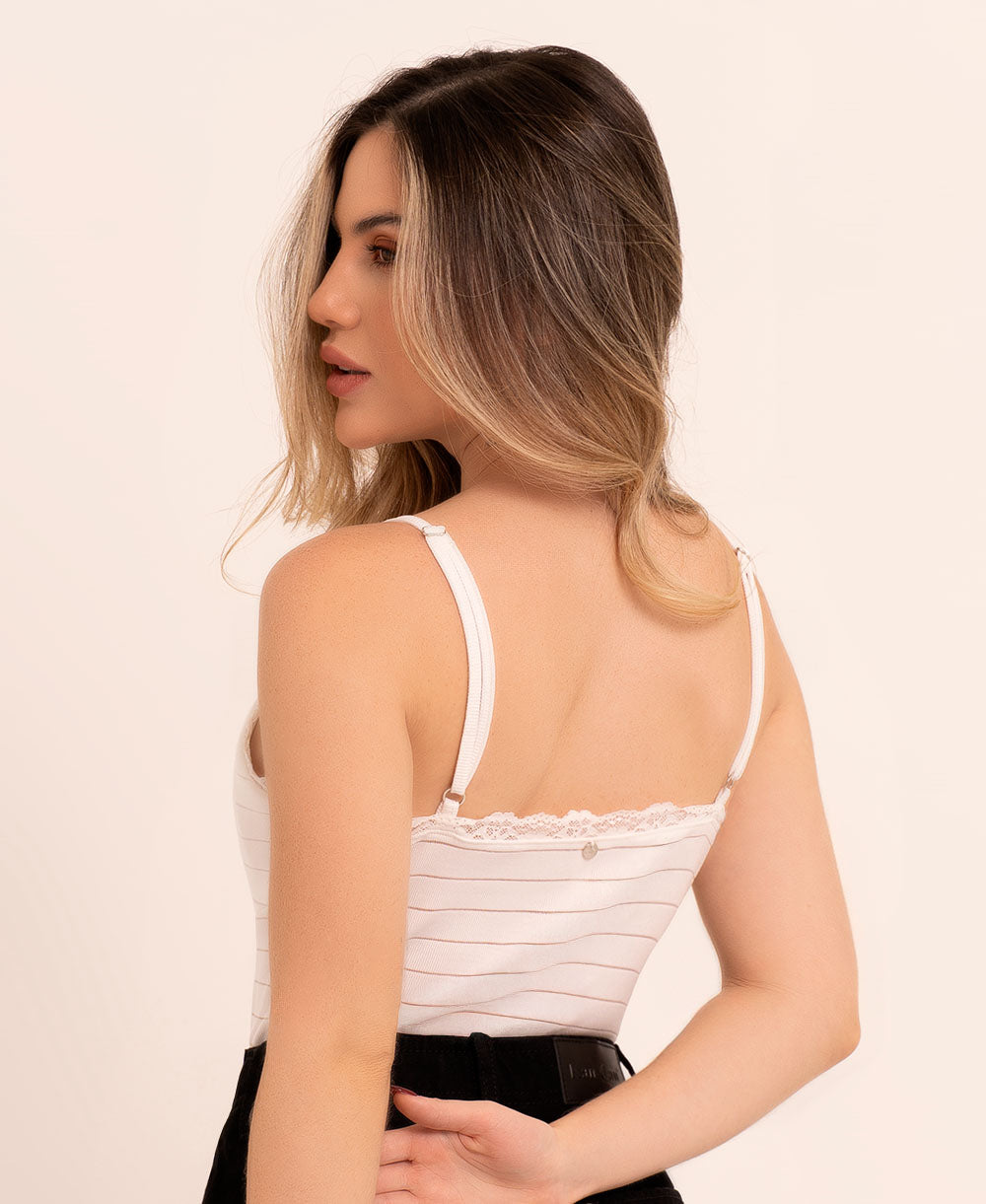 Blusa Natural en tejido acanalado de tacto suave con escote en V realzado por delicados detalles en encaje. Su diseño con tiras delgadas y silueta ajustada resalta la feminidad con un toque romántico y sofisticado. Ideal para crear looks versátiles que van del día a la noche con effortless elegance.
