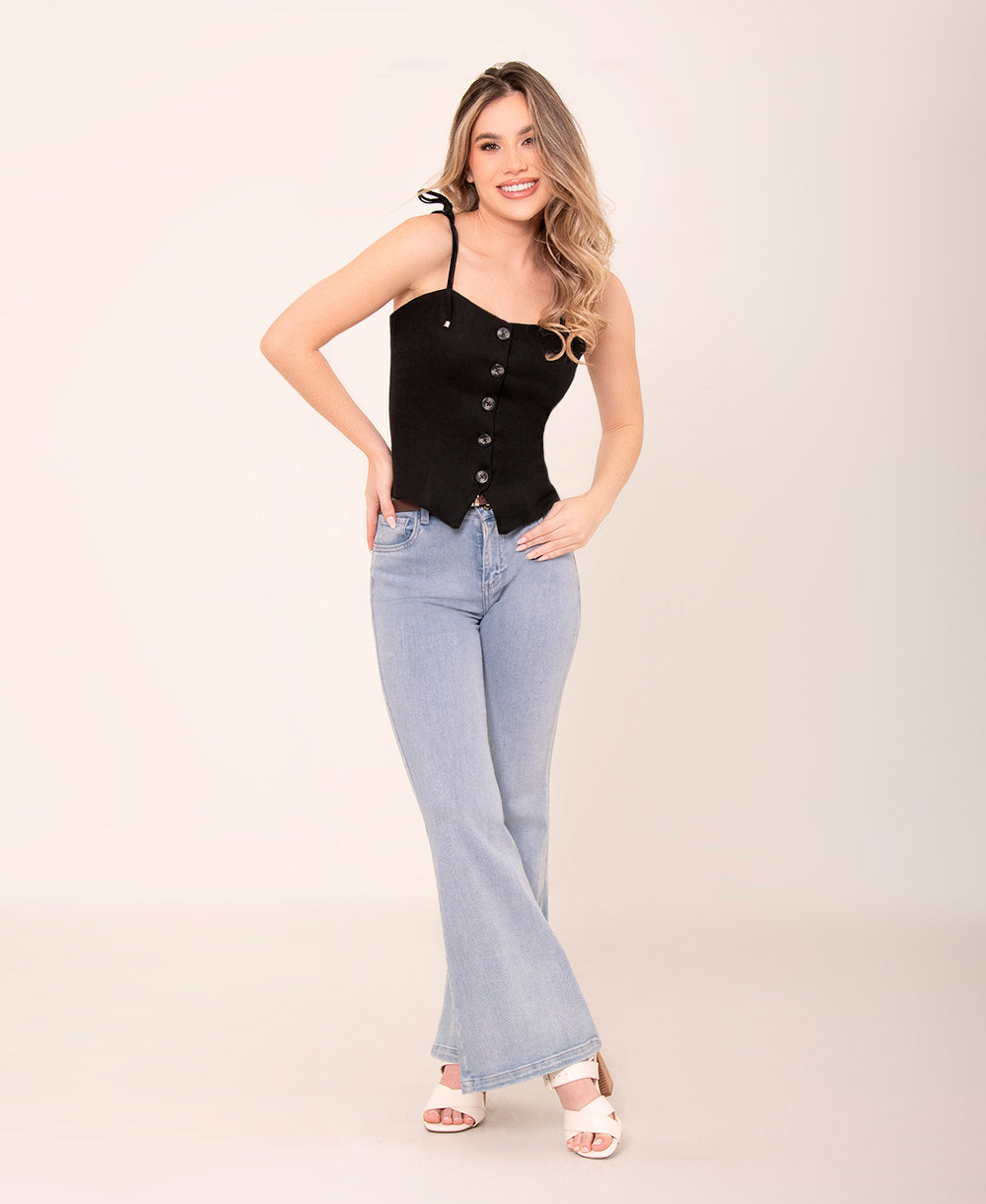 Blusa negra tiras ajustables y botones decorativos frontales que aportan un toque femenino y moderno. Su diseño entallado realza la figura con elegancia, mientras que el escote sutil y el corte inferior en pico lo convierten en una prenda versátil ideal para looks casuales o de noche. Combínalo con jeans o pantalones de tiro alto para un estilo sofisticado y sin esfuerzo.