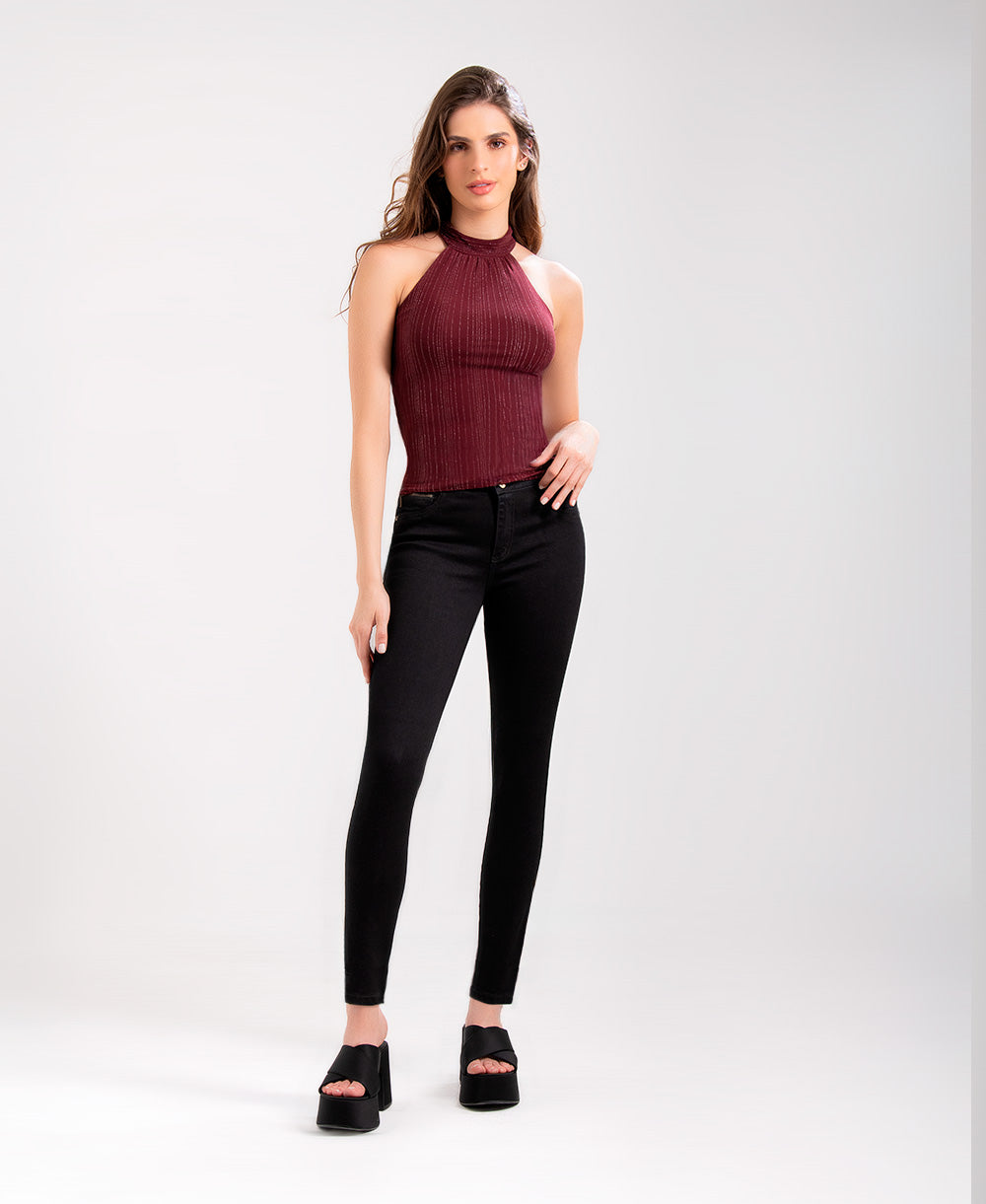 Blusa tipo halter de silueta ajustada, confeccionado en tejido elástico con textura acanalada y delicadas líneas de brillo que aportan un efecto sofisticado. Presenta cuello alto halter que realza los hombros y el escote, brindando un ajuste cómodo y favorecedor al cuerpo. Ideal para elevar looks de noche o para combinar con jeans y pantalones de tiro alto en outfits modernos y femeninos.
