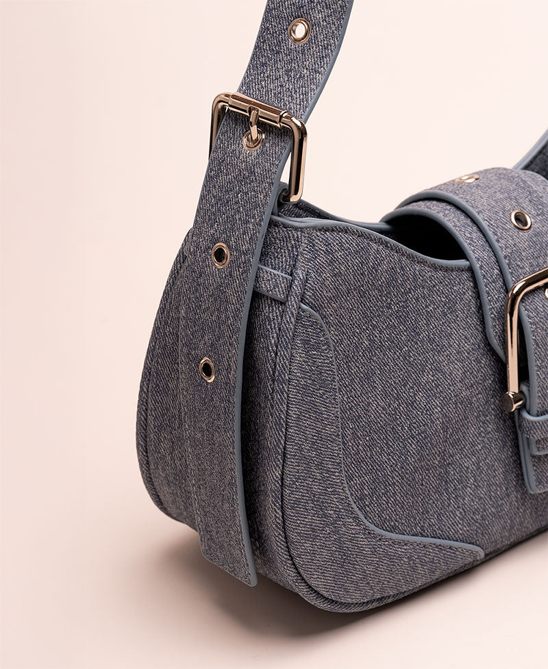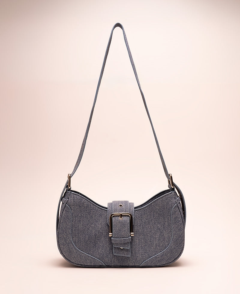 Un accesorio que define el estilo urbano con un toque chic. Este bolso baguette en denim es perfecto para complementar tus looks casuales con un aire moderno y femenino. Su diseño estructurado y la hebilla metálica frontal aportan personalidad, mientras que la correa ajustable permite llevarlo al hombro o cruzado para mayor versatilidad.