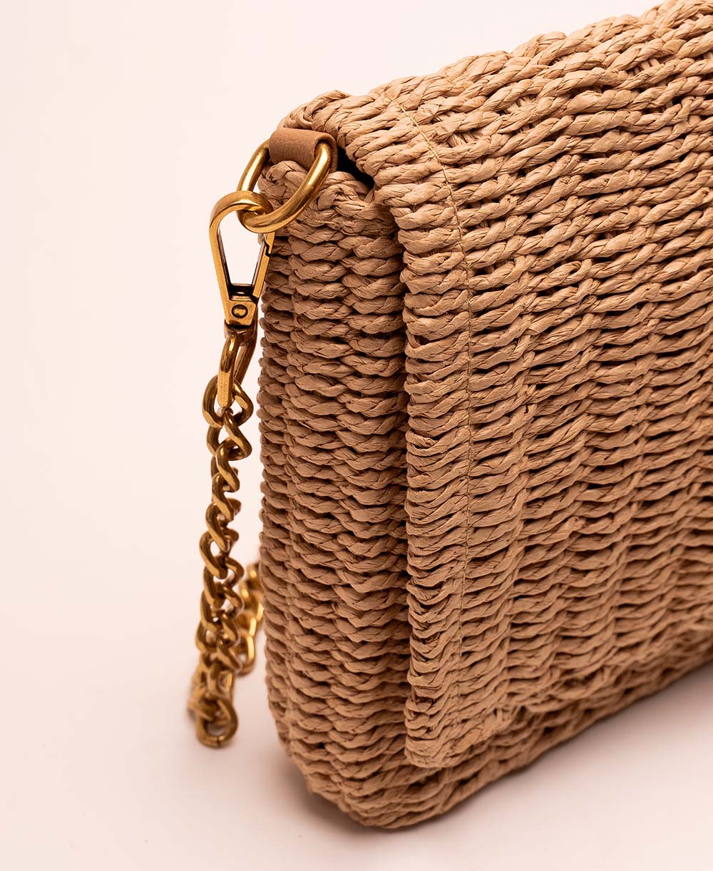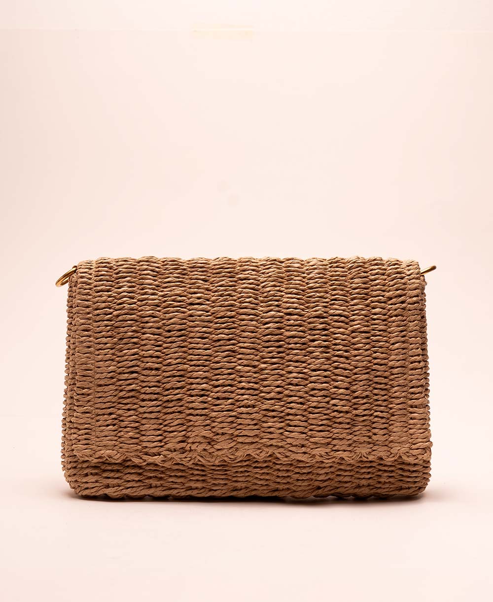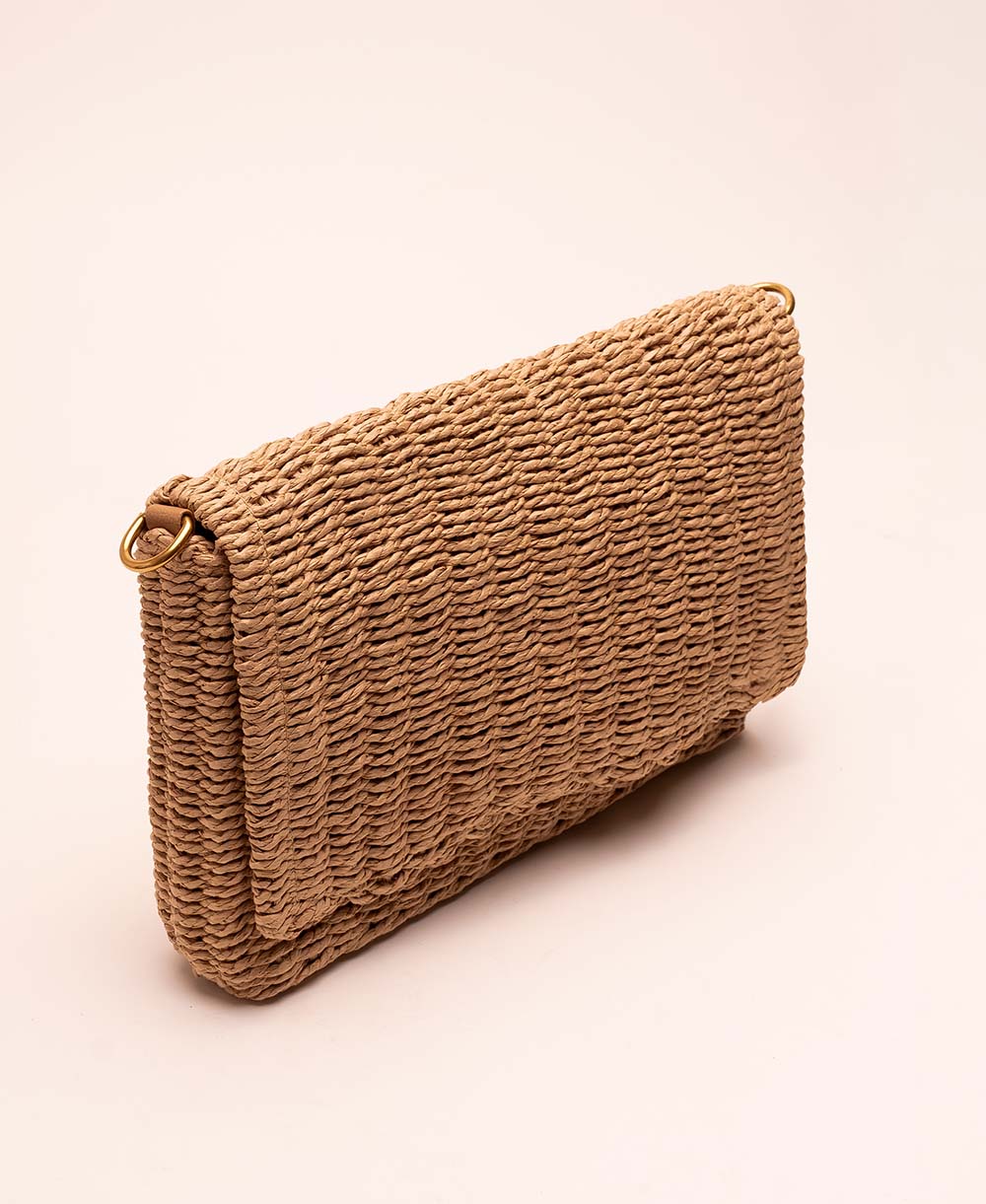 Bolso tipo clutch elaborado en fibra tejida con acabado natural inspirado en el estilo mediterráneo. Diseño estructurado con solapa amplia, textura artesanal y silueta rectangular. Incluye herrajes metálicos en tono dorado para adaptar cadena (opcional) y llevarlo en mano o al hombro. Ligero, versátil y atemporal; perfecto para looks de verano, escapadas a la playa o outfits minimalistas de ciudad.
