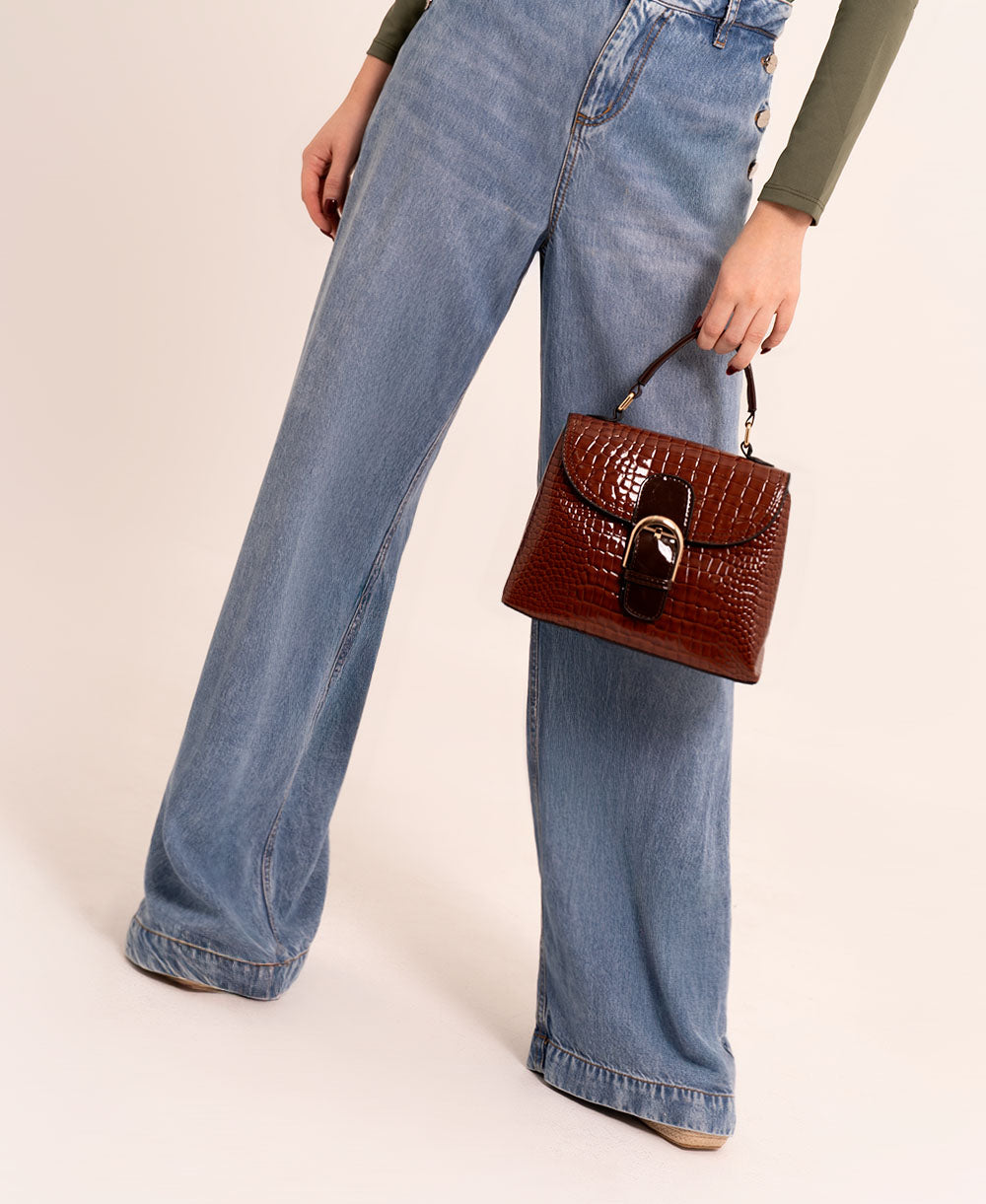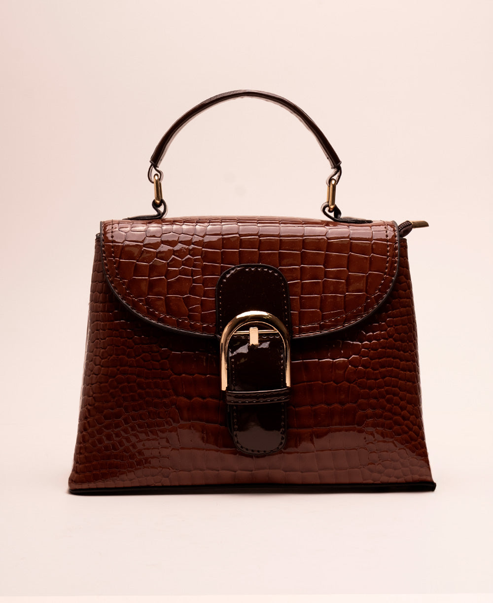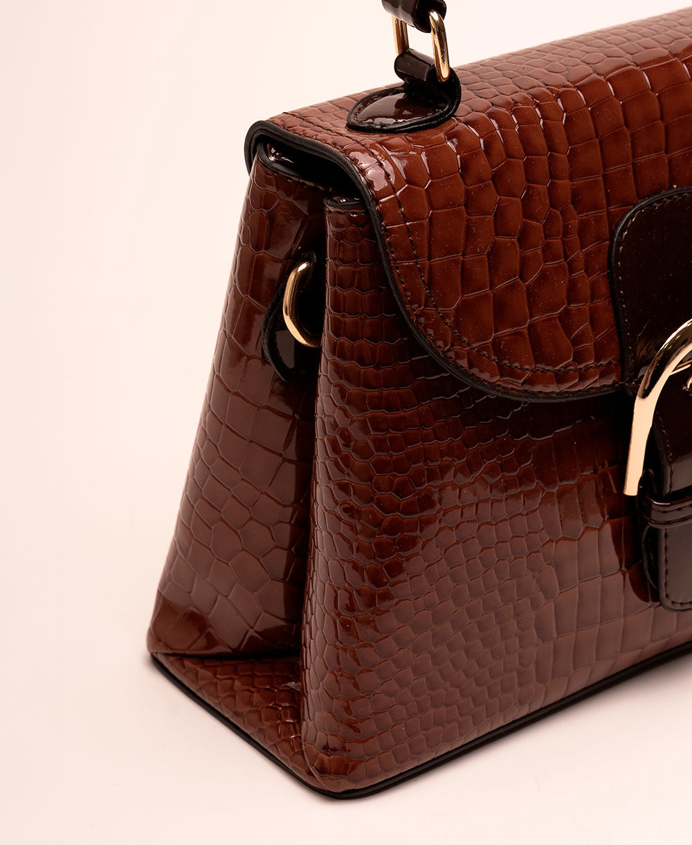 Bolso estructurado en acabado efecto charol con textura tipo cocodrilo. Su diseño elegante incluye herrajes dorados, cierre superior con broche decorativo y asa corta removible. Ideal para elevar cualquier look con un toque clásico y sofisticado, perfecto para día o noche.