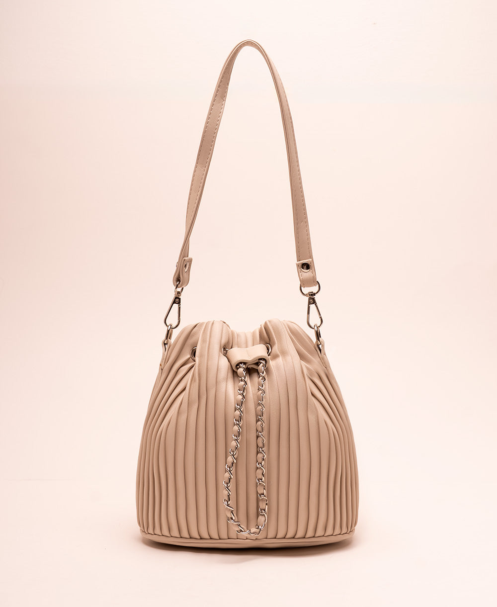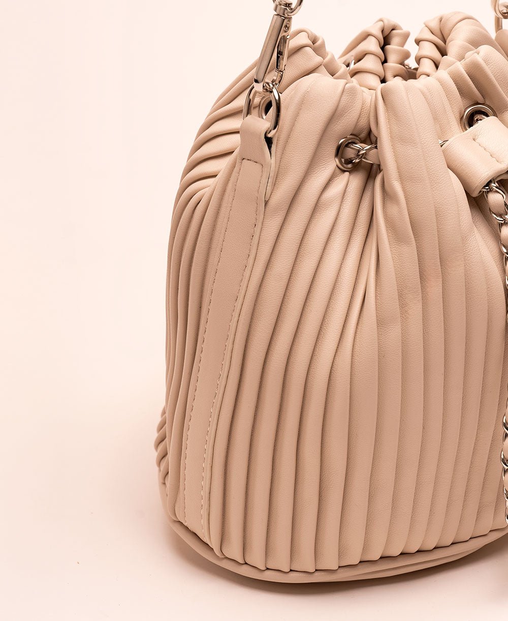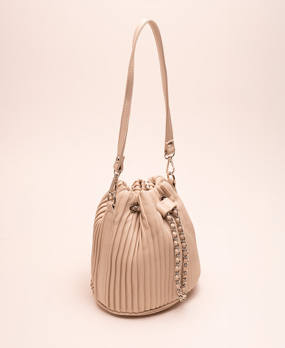 Bolso tipo bucket elaborado en eco cuero con acabado acolchado y textura acanalada que aporta un look moderno y sofisticado. Su diseño con cierre tipo frunce y cadena decorativa al frente combina funcionalidad con estilo urbano. Incluye asa removible para llevar al hombro o cruzado, ofreciendo versatilidad y comodidad en todo momento.