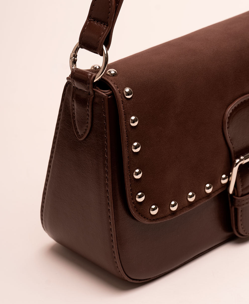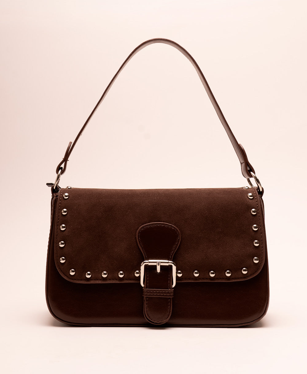 Bolso tipo baguette confeccionado en gamuza sintética con acabado aterciopelado, decorado con taches metálicos que aportan un aire moderno y sofisticado. Su diseño estructurado se complementa con una hebilla decorativa frontal y una correa corta para llevar al hombro.