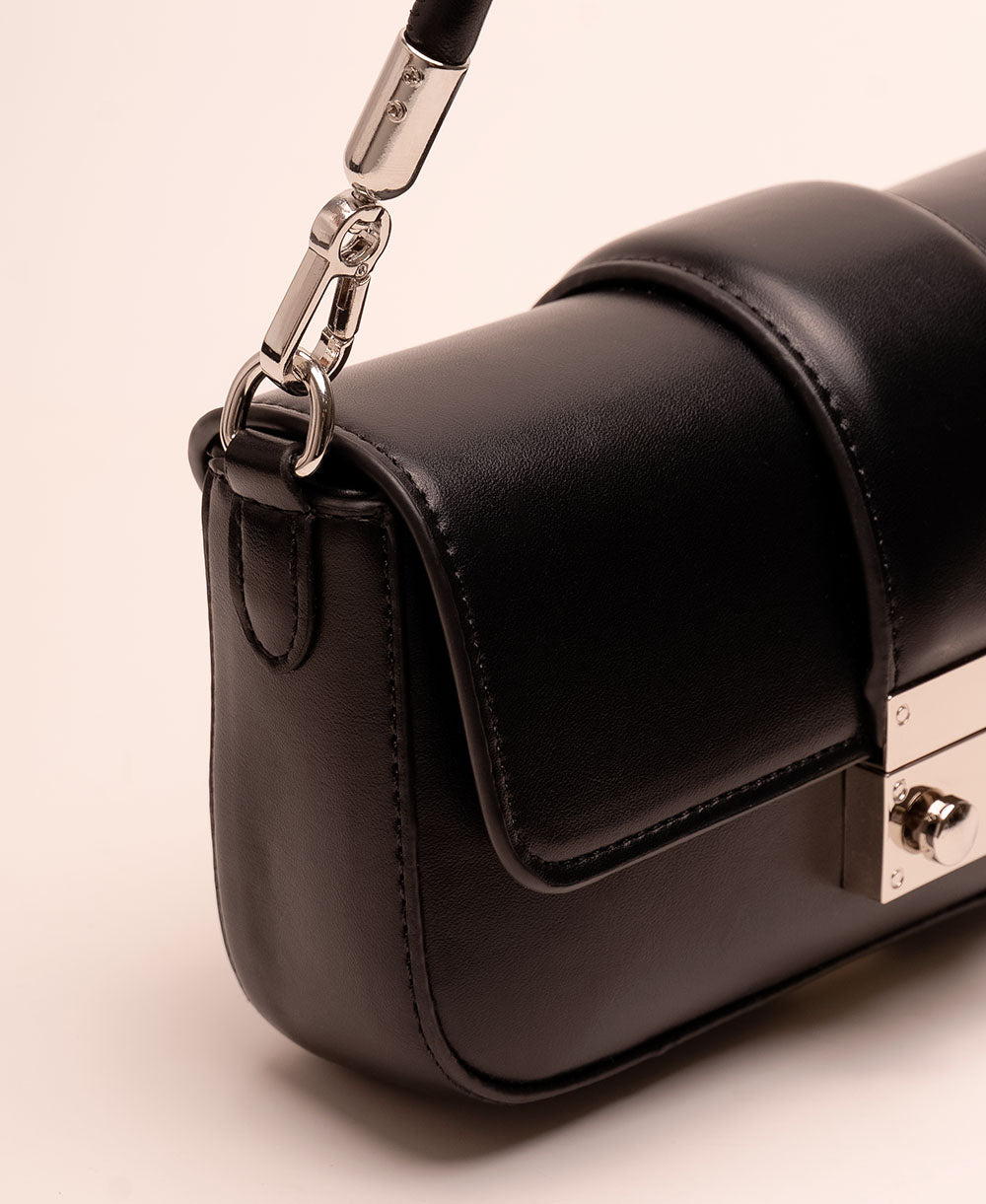 Bolso tipo baguette elaborado en eco cuero de acabado liso con estructura semirrígida que mantiene su forma. Su diseño minimalista destaca por el herraje metálico frontal y la correa ajustable con herrajes en tono plateado, que aportan un toque moderno y elegante. Compacto pero funcional, es el accesorio perfecto para acompañar tus looks diarios o elevar un outfit de noche con sofisticación.