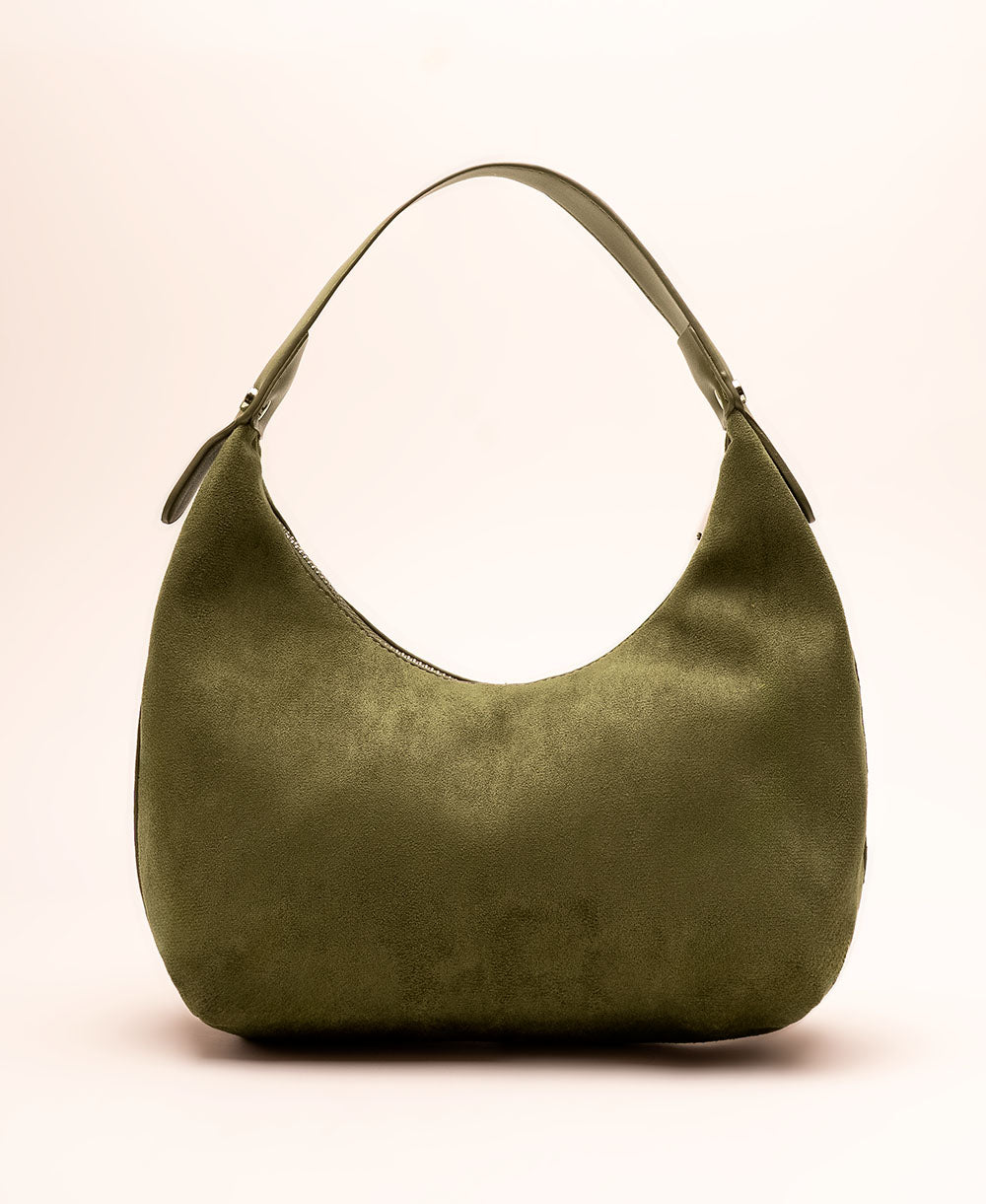 | Bolso tipo hobo confeccionado en material tipo gamuza color oliva, con textura suave al tacto y estructura semirrígida que conserva su forma sin perder fluidez. Su diseño minimalista con asa ancha permite llevarlo cómodamente al hombro, mientras que su amplio compartimento interior con cierre en cremallera lo hace funcional y práctico para el día a día. |