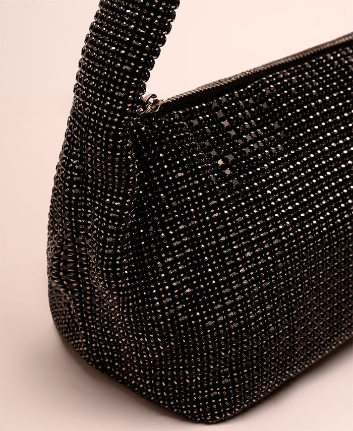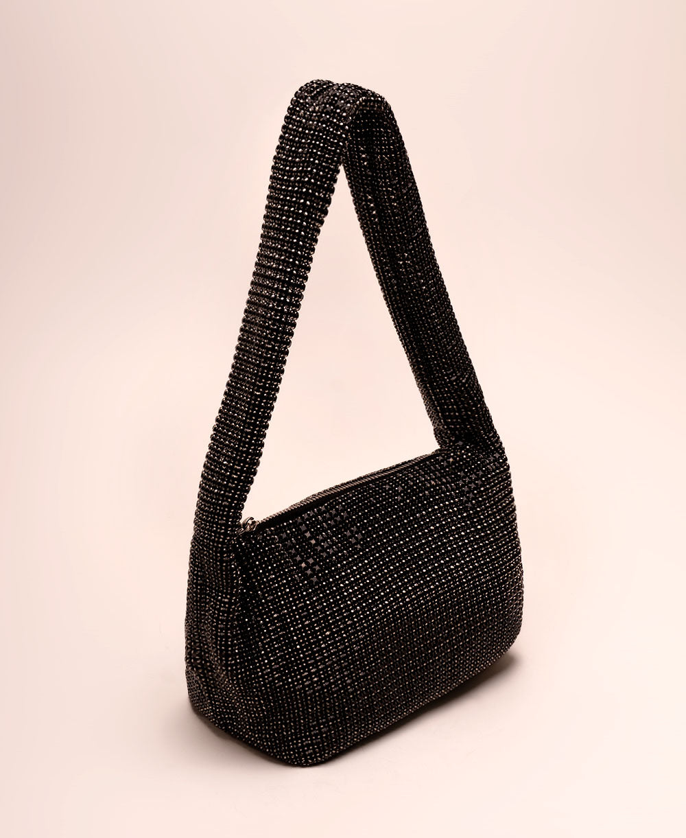 Bolso tipo baguette elaborado en malla de cristales, perfecto para elevar looks de noche o complementar outfits con un toque glam. Su diseño estructurado con brillo en toda la superficie aporta un estilo moderno y sofisticado. Cuenta con asa amplia acolchada para llevar cómodamente al hombro y cierre superior para mayor seguridad. Ideal para salir, eventos especiales o estilizar looks minimalistas con un acento de lujo.