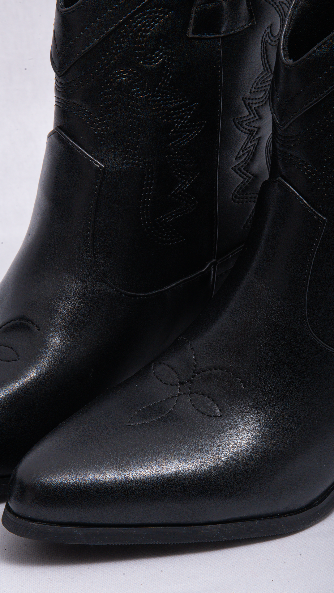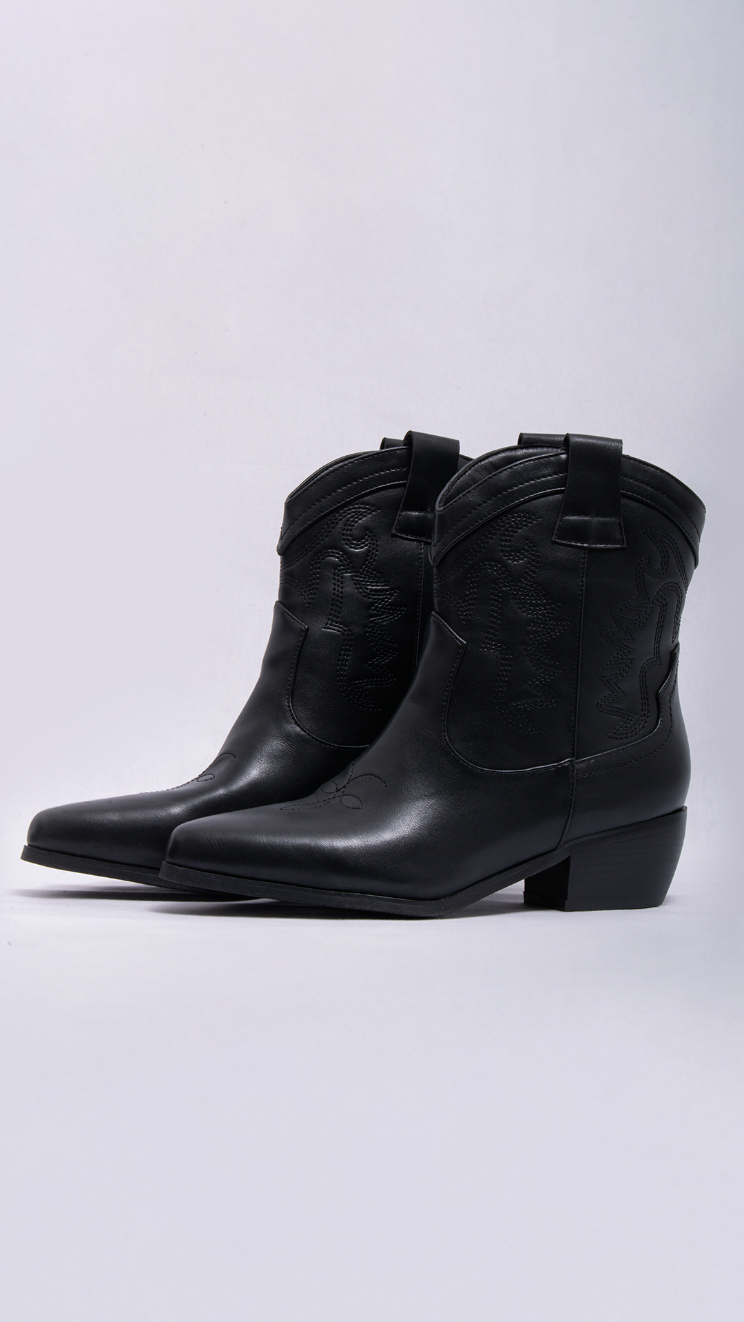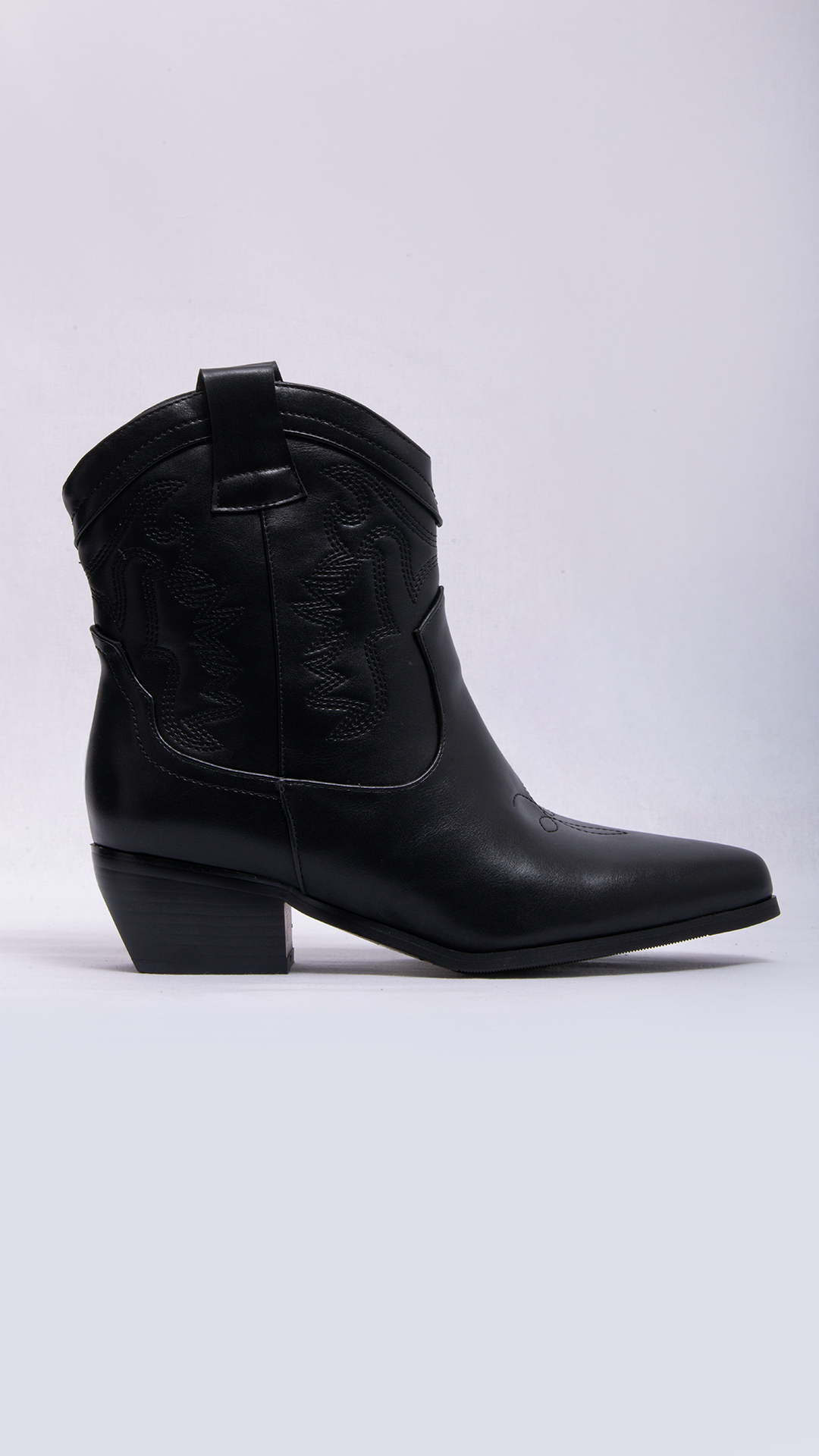Botín de inspiración western elaborado en material tipo cuero de acabado liso, con caña corta y diseño estructurado que aporta carácter y versatilidad. Incorpora costuras decorativas con relieve en la parte superior, que evocan el clásico estilo vaquero, y tirador posterior para facilitar el calce. Su tacón bajo y ancho brinda estabilidad y comodidad, mientras que la punta ligeramente afinada estiliza el pie. Ideal para complementar looks casuales o urbanos con un toque moderno y femenino.