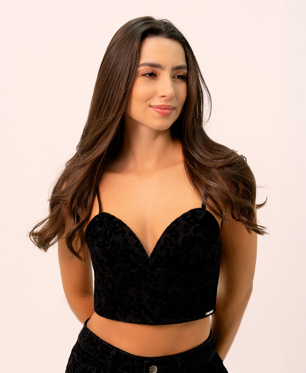 Bralet Negro animal print, elaborado en tejido jacquard con delicado acabado animal print en relieve. Su escote en corazón realza la figura, mientras los tirantes delgados aportan un toque sofisticado. La estructura del busto brinda soporte sutil y un fit que resalta la silueta. Ideal para looks nocturnos con estilo y actitud