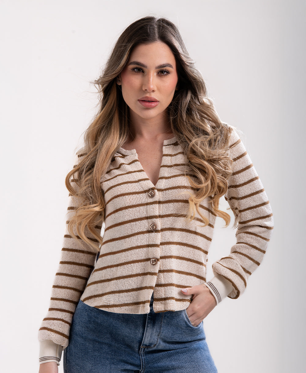 Buso Camel manga larga ligero y suave, perfecto para darle un toque romántico y moderno a tu outfit diario. Presenta un diseño tejido de rayas en tonos beige y camel, con botones frontales en el mismo color que aportan armonía visual. Su escote en “V” estiliza el cuello y permite combinarlo fácilmente con tops o camisetas básicas. Ideal para días frescos o para complementar tus looks casuales con jeans y accesorios dorados.