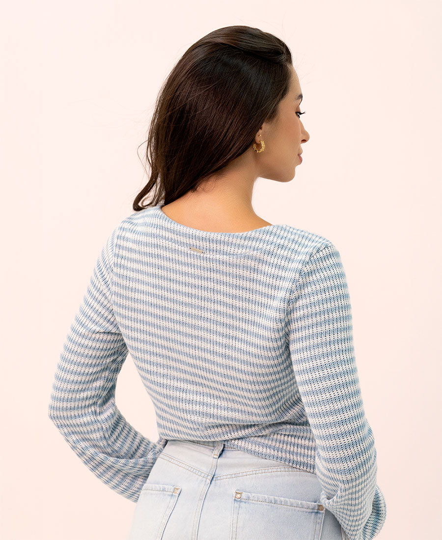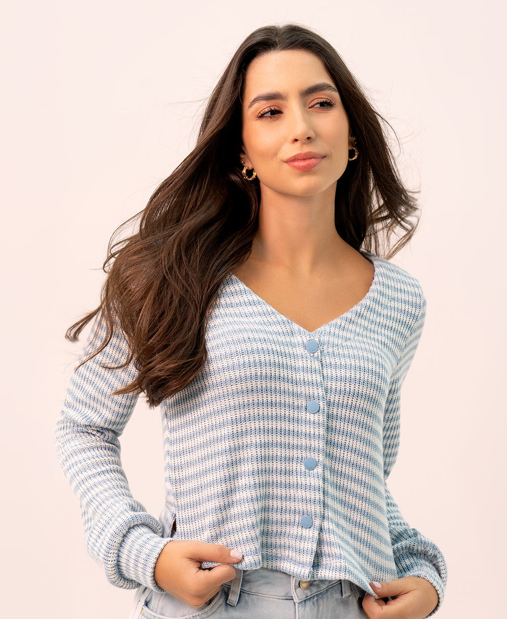 Eleva tu look con un cardigan ligero y suave, perfecto para darle un toque romántico y moderno a tu outfit diario. Presenta un diseño tejido de rayas en tonos celeste y blanco, con botones frontales en el mismo color que aportan armonía visual. Su escote en “V” estiliza el cuello y permite combinarlo fácilmente con tops o camisetas básicas. Ideal para días frescos o para complementar tus looks casuales con jeans y accesorios dorados.