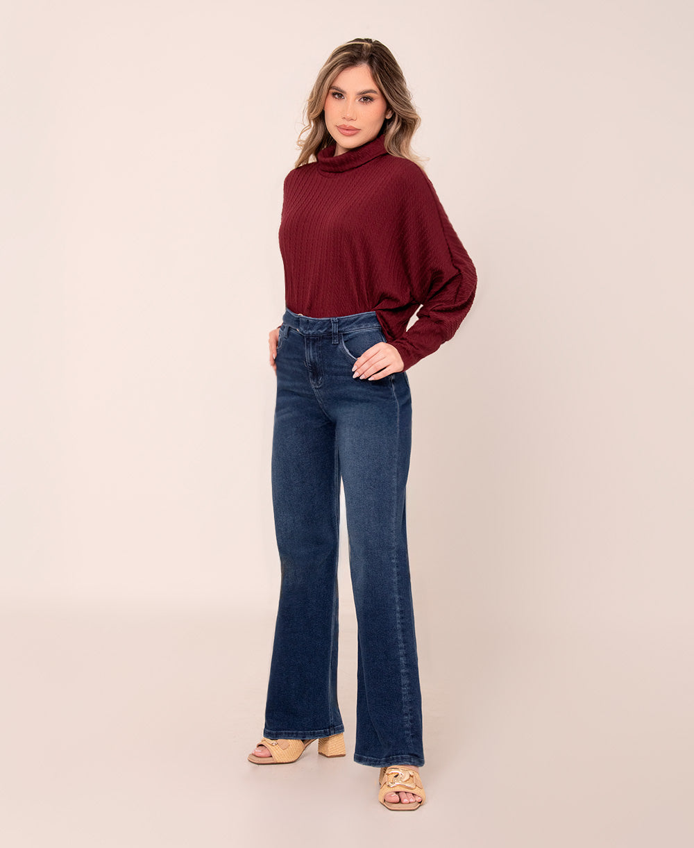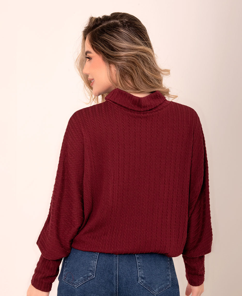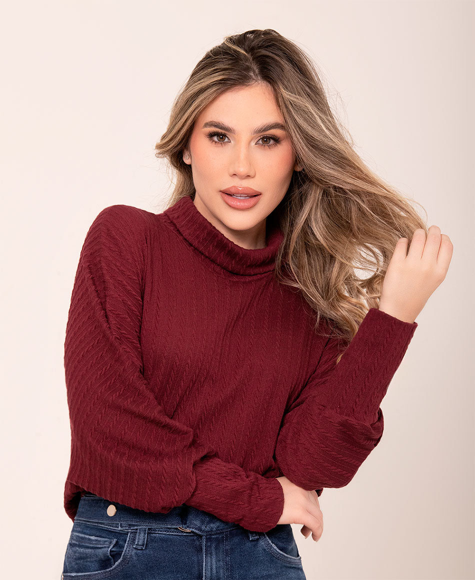 Buso vinotinto manga larga, confeccionada en tejido de punto con textura acanalada en relieve. Presenta cuello tortuga, silueta semiajustada y mangas largas tipo globo con puño ajustado. Su tejido elástico proporciona confort y un calce favorecedor. Ideal para climas frescos y para complementar looks casuales o de oficina con un toque sofisticado.