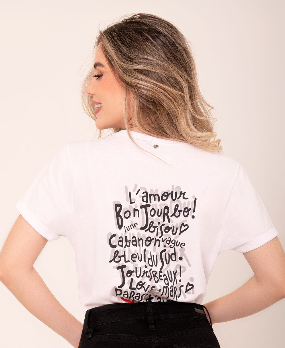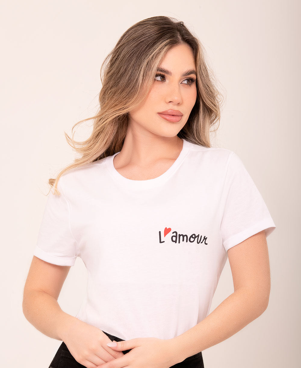 Camiseta confeccionada en tejido de punto de algodón suave al tacto, con silueta recta y ajuste clásico. Presenta cuello redondo, mangas cortas y detalle de estampado frontal con la palabra “L’amour” en contraste, que aporta un toque femenino y moderno. Su material liviano ofrece comodidad y frescura para uso diario..
