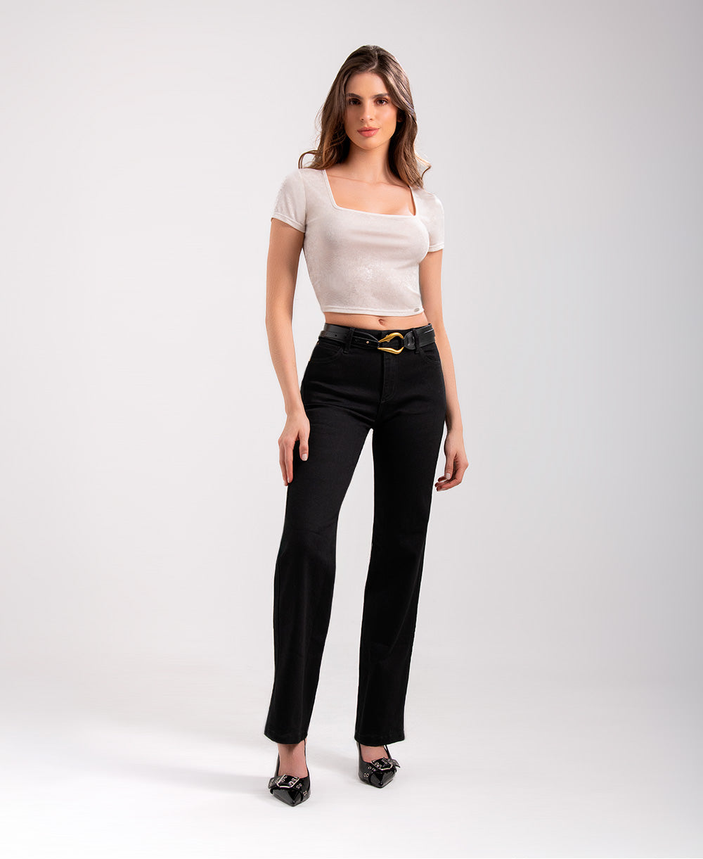 Esta camiseta manga corta está confeccionado en un tejido tipo velvet suave con acabado ligeramente satinado que aporta un toque elegante y sofisticado. Su escote cuadrado realza la zona del cuello y brinda un look moderno y femenino. De ajuste cómodo y favorecedor, es perfecto para combinar con jeans, faldas o pantalones tiro alto. Ideal para outfits casuales o para elevar tus looks de noche con un toque sutil de brillo.