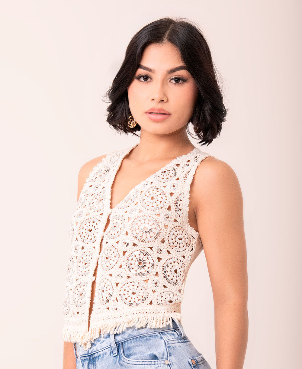 El Chaleco Crochet Boho Chic combina lo artesanal con lo moderno en una prenda llena de encanto. Su tejido calado con diseño circular y delicados flecos en el ruedo aporta un aire fresco y femenino. Sin mangas y con escote en “V”, es ideal para usar sobre tops o blusas ligeras, logrando un look relajado y con estilo. Perfecto para darle un toque bohemio y romántico a cualquier outfit.