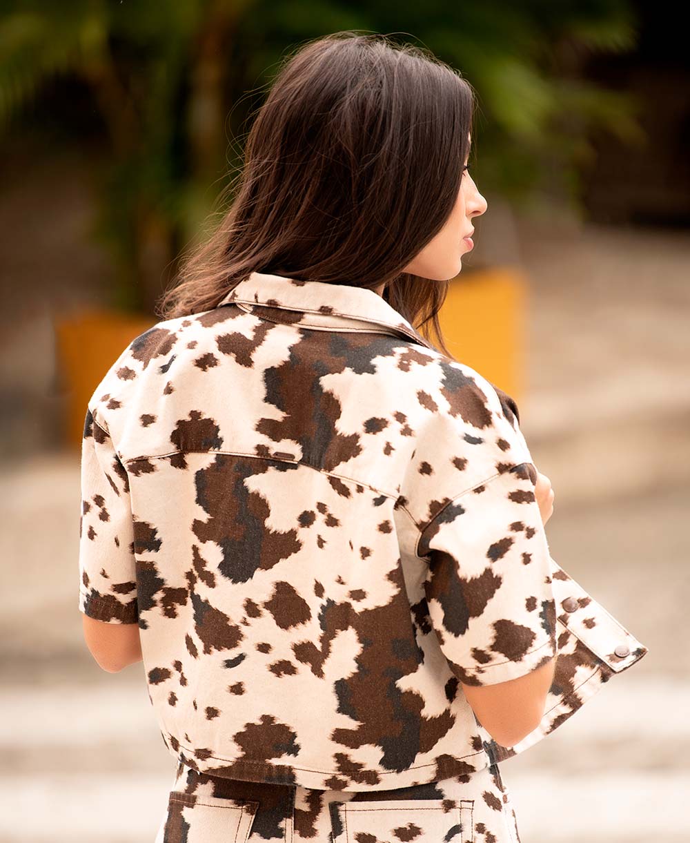 Esta chaqueta corta en denim con estampado animal print combina fuerza y estilo en una sola pieza. Su silueta estructurada con cuello clásico, bolsillos frontales y mangas cortas aporta un toque moderno y audaz, ideal para looks casuales con actitud. Hecha en denim suave y resistente, su diseño celebra la libertad y la autenticidad de la mujer contemporánea. Perfecta para combinar con jeans o shorts, creando un conjunto único que impone tendencia.