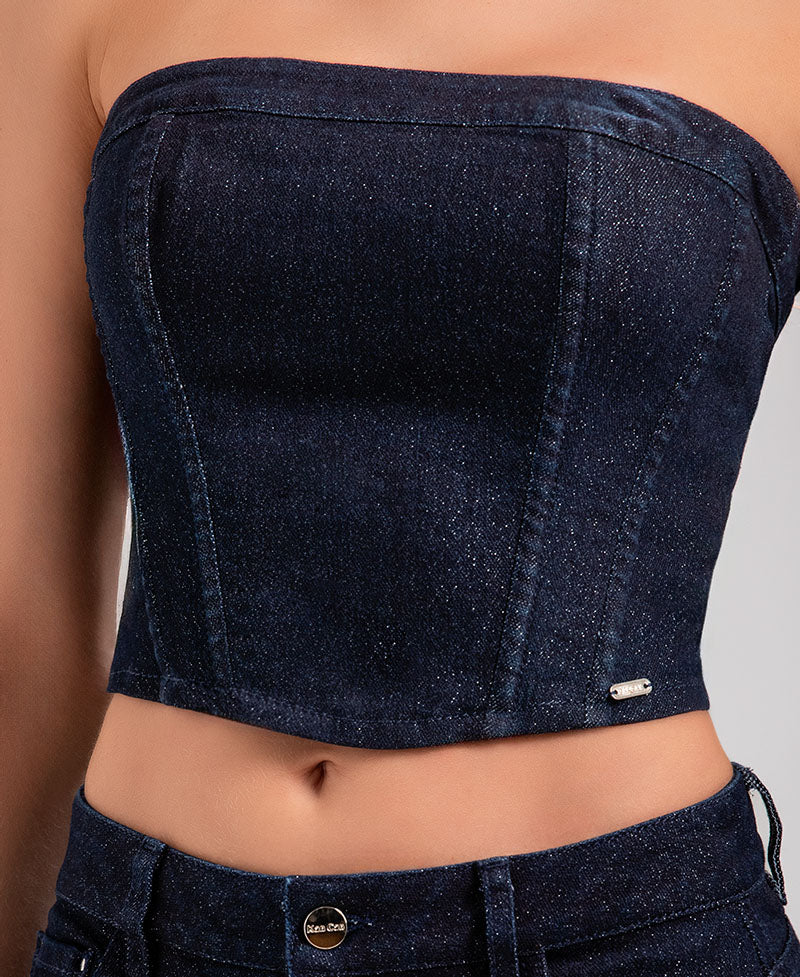 Eleva tus looks con este bustier strapless en denim oscuro, diseñado con un fit estructurado que realza tu figura. Su confección en mezclilla rígida incorpora un acabado brillante tipo “denim foil” que aporta destellos sutiles y modernos sin perder la esencia del jean. Es ideal para combinar con prendas de tiro alto y crear outfits nocturnos, sexys y sofisticados