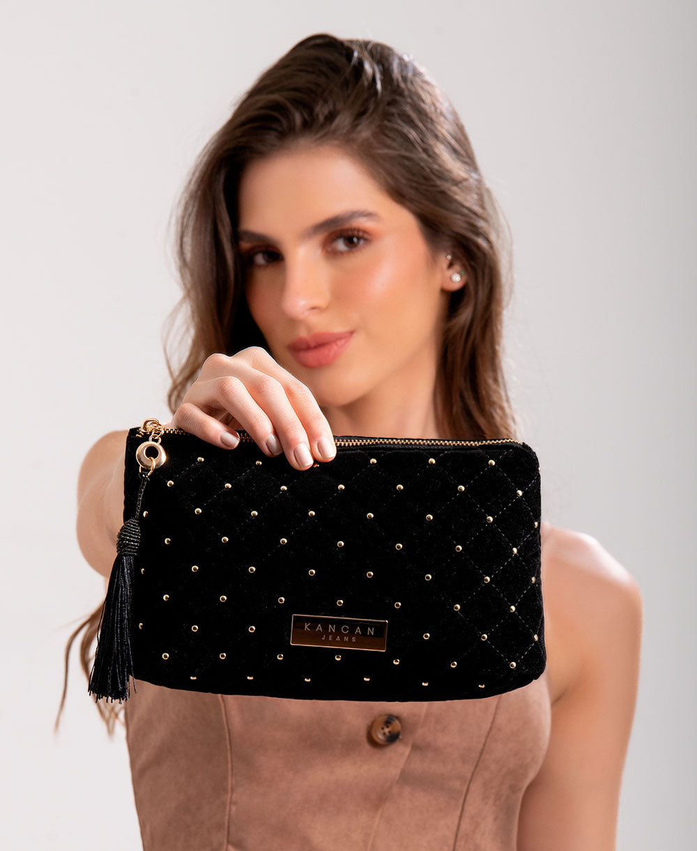 Este elegante clutch de mano está confeccionado en terciopelo negro acolchado con un diseño de rombos y aplicaciones metálicas tipo tachuela que aportan un toque sofisticado. Cuenta con un cierre superior metálico, un adorno lateral con borla y una placa frontal decorativa que realza su estilo. Su tamaño compacto lo hace ideal para llevar cosméticos, accesorios pequeños o lo esencial para una salida nocturna. Combina perfectamente con atuendos formales y casuales gracias a su diseño moderno y versátil.