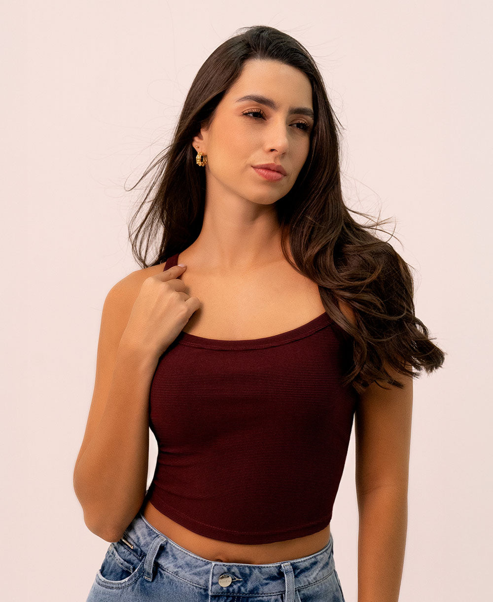 Un básico imprescindible para tu clóset. Este top tipo crop, confeccionado en tela acanalada suave y elástica, se ajusta a tu figura realzando tu silueta de forma natural. Su color vinotinto es perfecto para crear looks casuales, femeninos y llenos de estilo.