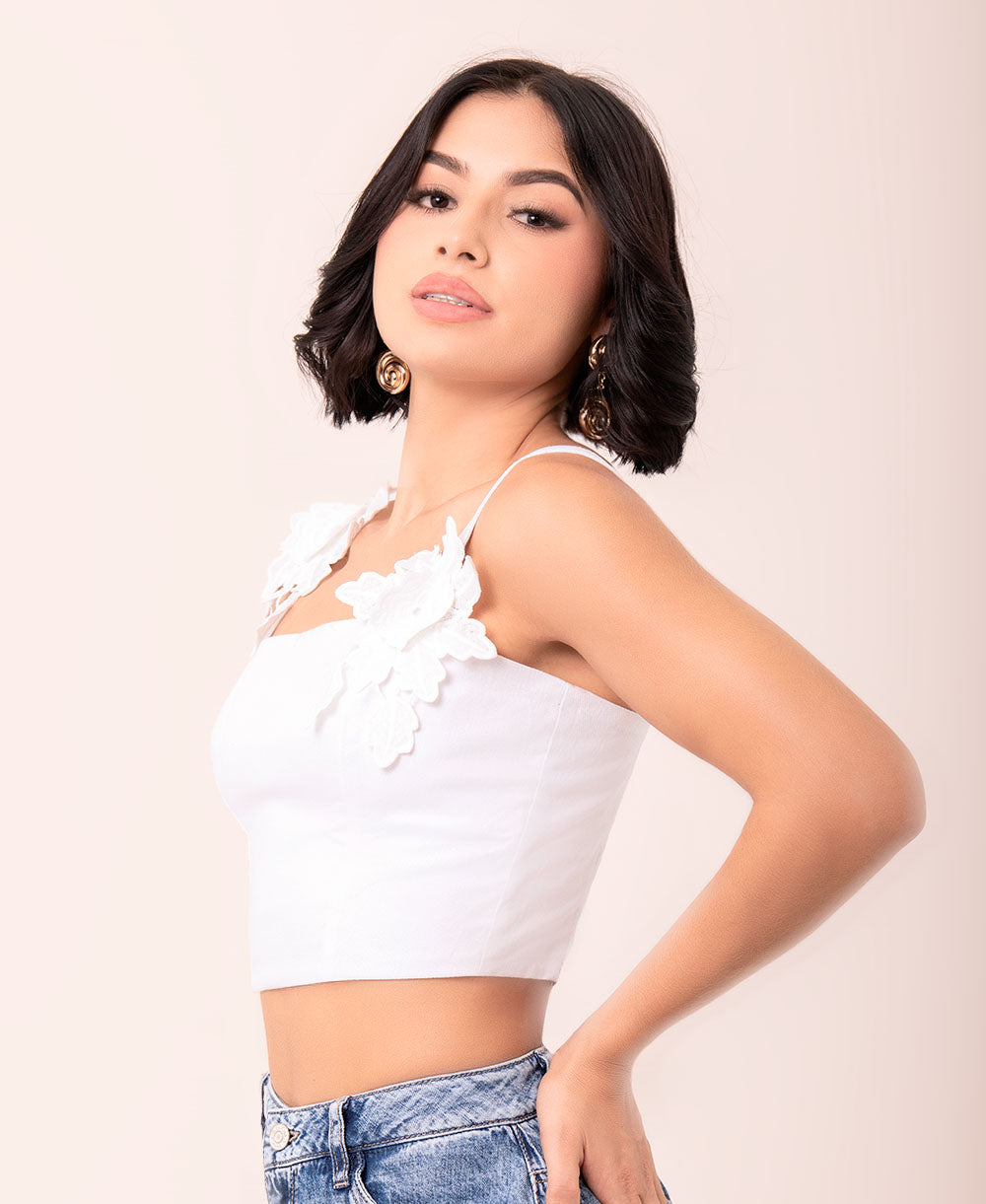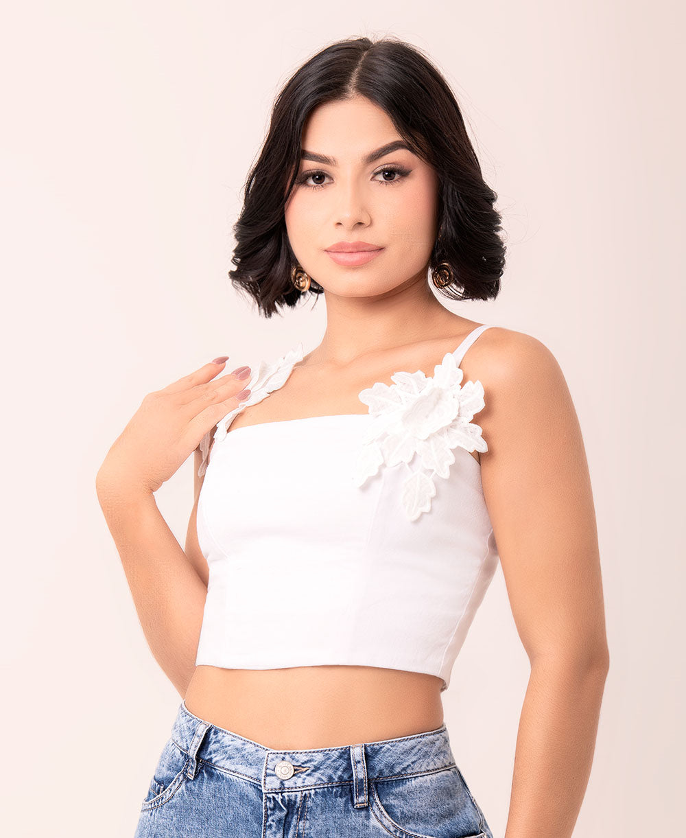 El Top Floral Eterno es una prenda femenina y delicada que resalta tu estilo con elegancia. Su diseño tipo crop, con tiras delgadas y apliques florales en relieve sobre los hombros, le da un toque romántico y moderno. Confeccionado en una tela suave y estructurada que realza la figura, es ideal para combinar con jeans o faldas y crear looks frescos y versátiles. Perfecto para los días soleados o salidas especiales donde quieras destacar con sutileza y encanto.