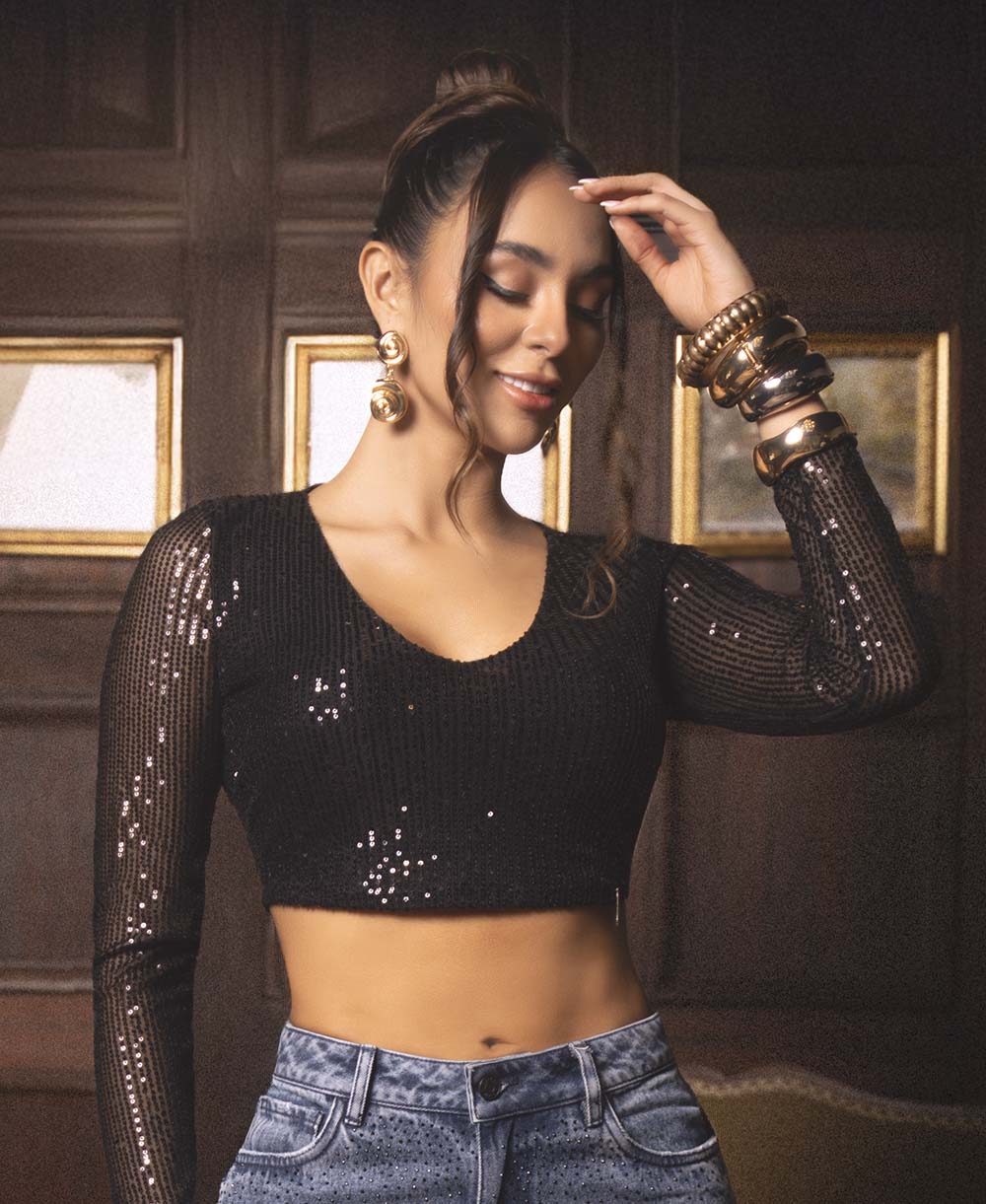 Este elegante crop top está confeccionado en un tejido cubierto de lentejuelas negras que aporta un brillo sofisticado ideal para eventos nocturnos y outfits festivos. Presenta un favorecedor escote en V y mangas largas semitransparentes que añaden un toque moderno y femenino. Su corte corto realza la cintura y permite combinarlo fácilmente con faldas, jeans de tiro alto o pantalones de vestir. Ligero, llamativo y cómodo, es la prenda perfecta para crear looks impactantes en fiestas, celebraciones y salidas especiales.