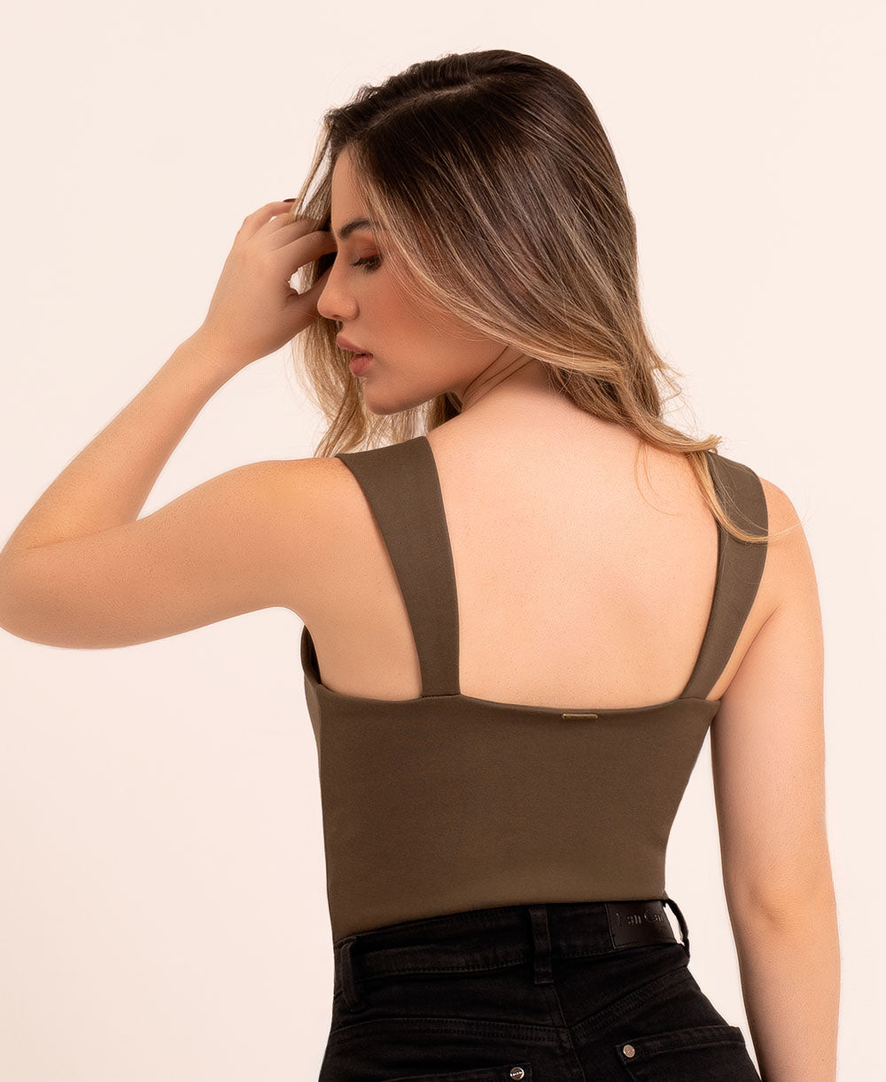 Croptop Verde oliva manga sisa confeccionado en tejido plano con estructura firme que realza la silueta. Presenta tirantes anchos y cortes delanteros que aportan una horma ajustada al cuerpo. Su diseño limpio y minimalista lo convierte en una prenda versátil, ideal para combinar con prendas de tiro alto y crear looks sofisticados o casuales.