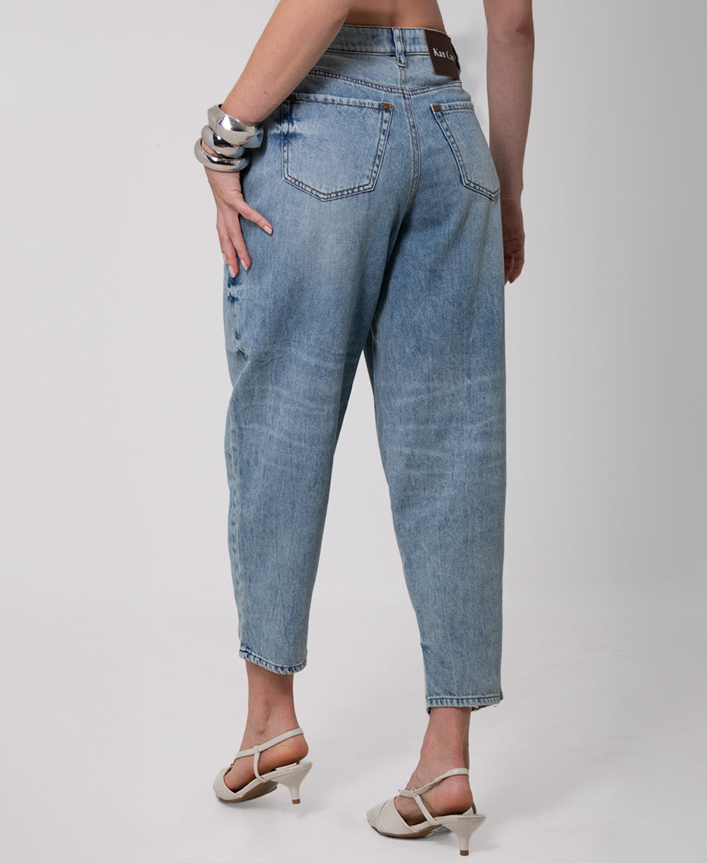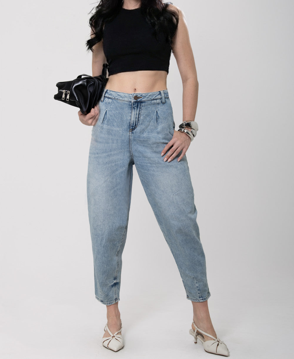 Jean en denim azul claro de silueta barrel, con volumen amplio en cadera y muslos que se ajusta suavemente hacia el tobillo, creando una forma curva y moderna. Diseño de tiro alto con pretina estructurada, cierre frontal con cremallera y botón metálico. Incorpora pinzas delanteras que aportan mayor estructura y realzan la silueta característica del fit.