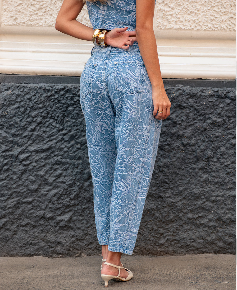 Jean de tiro alto y silueta barrel, caracterizado por su volumen suave en la pierna y ajuste en el tobillo, que aporta un look contemporáneo y favorecedor. Confeccionado en denim con estampado botánico, cuenta con bolsillos funcionales y cierre frontal. Ideal para crear outfits casuales, frescos y en tendencia.