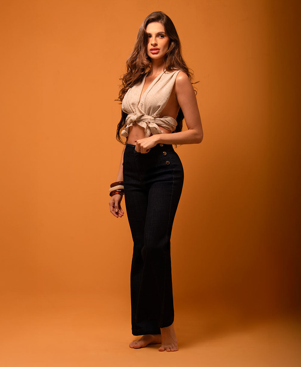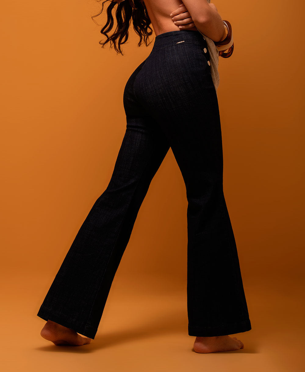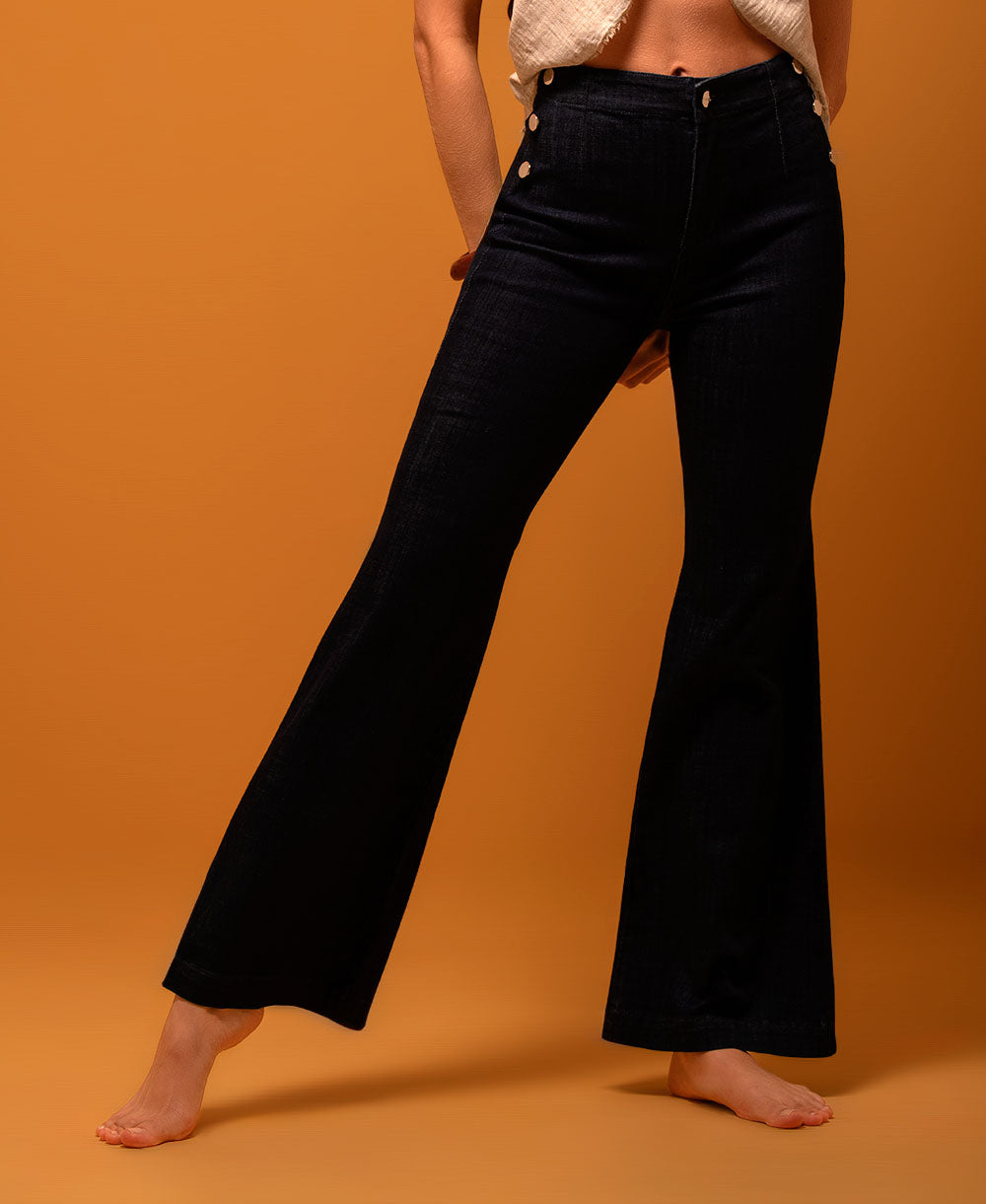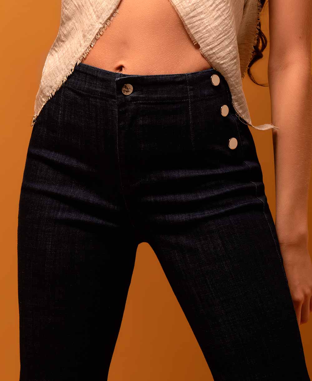 Jean tiro alto en tono azul oscuro, con diseño de bota campana y detalles de botones metálicos en los costados que estilizan la figura. Su corte favorece la silueta y aporta un toque retro moderno, ideal para combinar con tops ajustados o blusas sueltas para un look versátil y sofisticado.