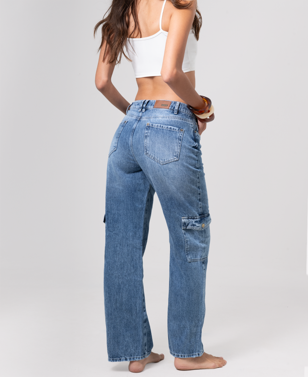 Jean tipo cargo en denim azul lavado medio. Cuenta con pretina clásica, cierre con botón y cremallera, bolsillos tradicionales y bolsillos cargo laterales que refuerzan su estilo utilitario y moderno. Ideal para looks casuales y urbanos.