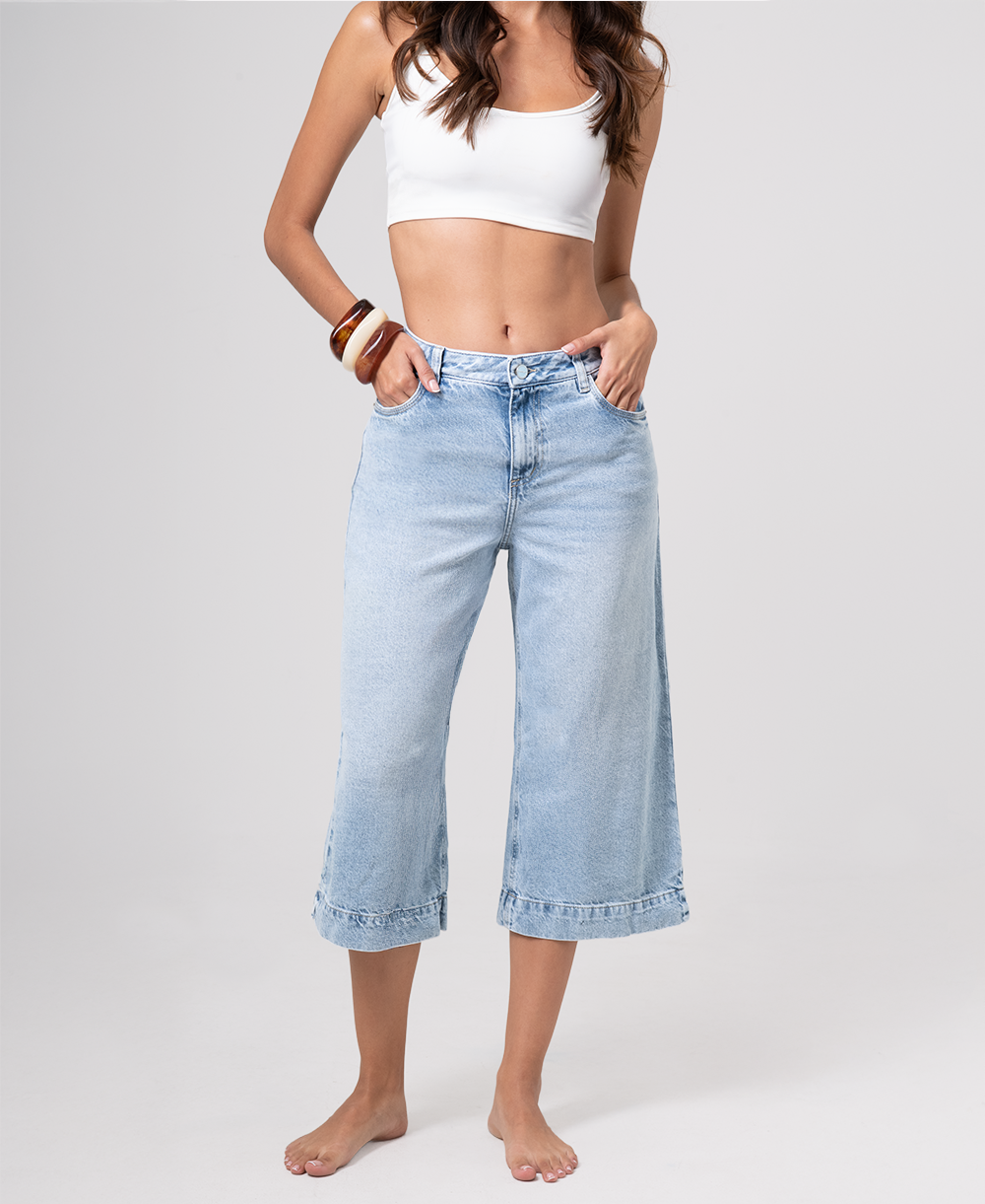Jean culotte en denim azul claro, que se caracteriza por su amplitud desde la cadera hasta la bota y su terminación a media pierna (debajo de la rodilla). Su diseño aporta movimiento, frescura y un look contemporáneo, ideal para combinaciones casuales o outfits más estructurados. La bota amplia incorpora un dobladillo ancho que aporta estructura y definición al diseño, reforzando su estilo moderno y relajado.