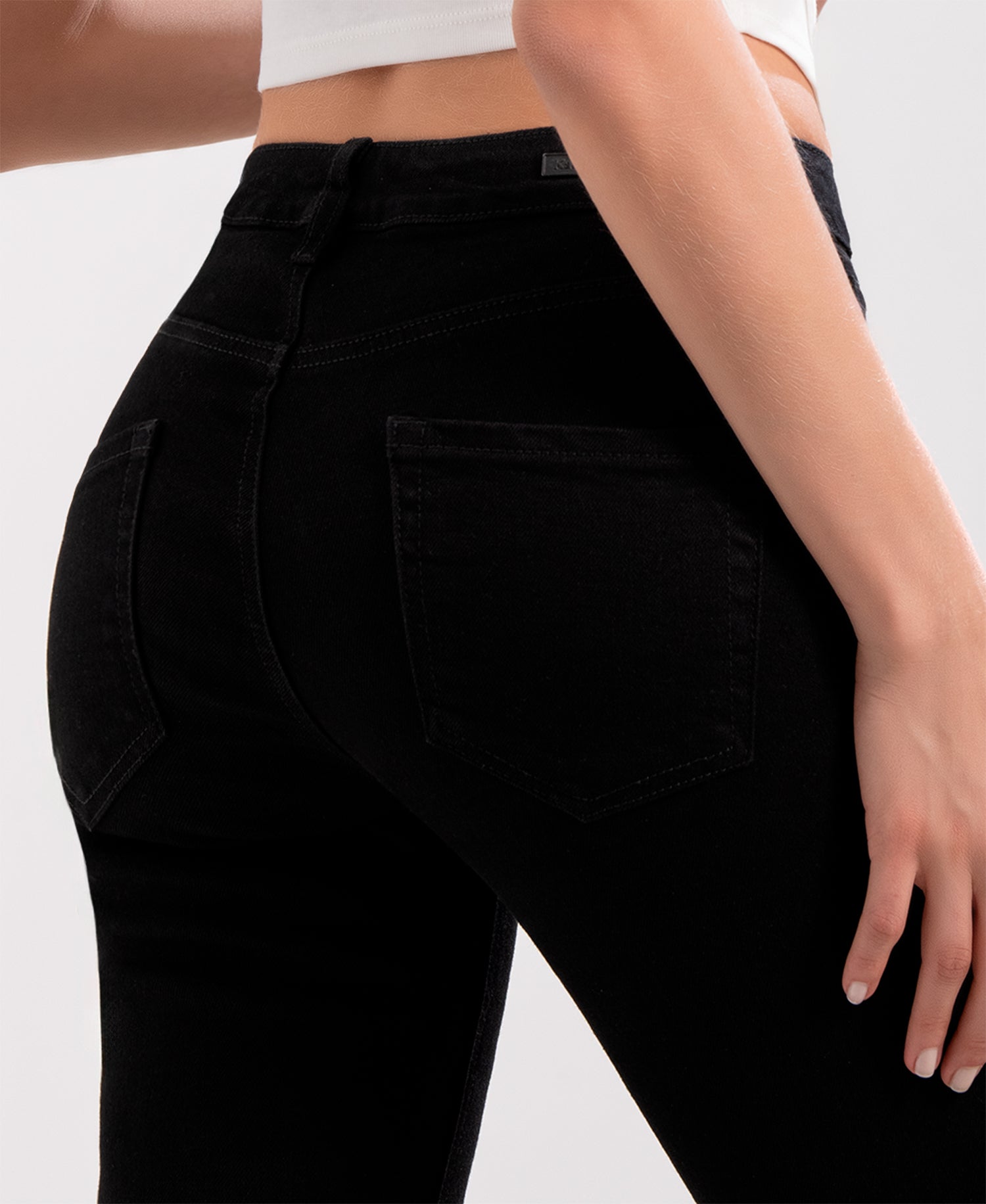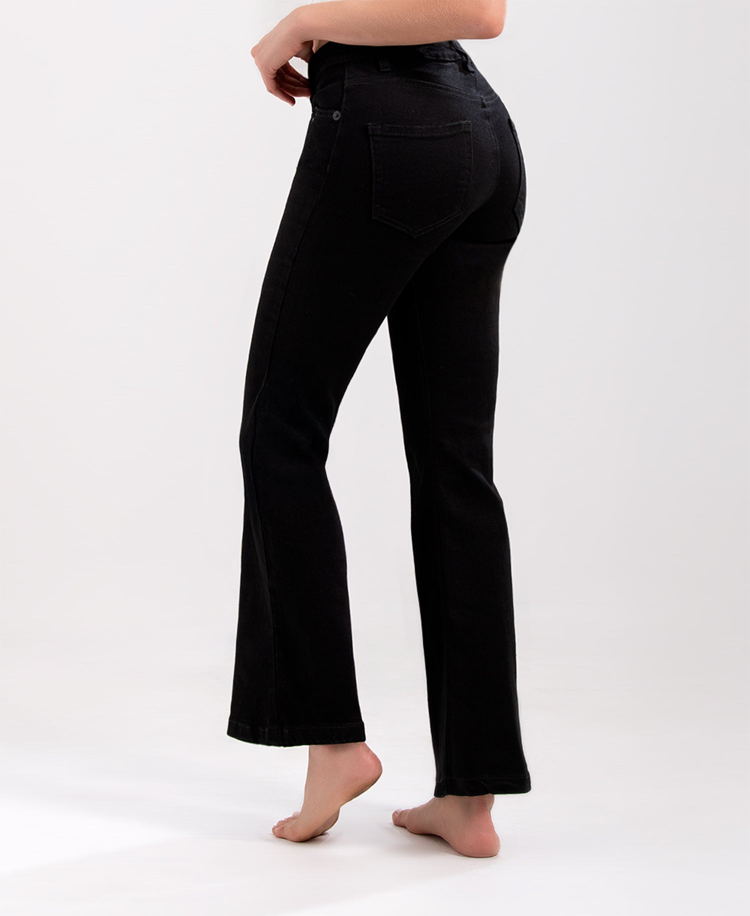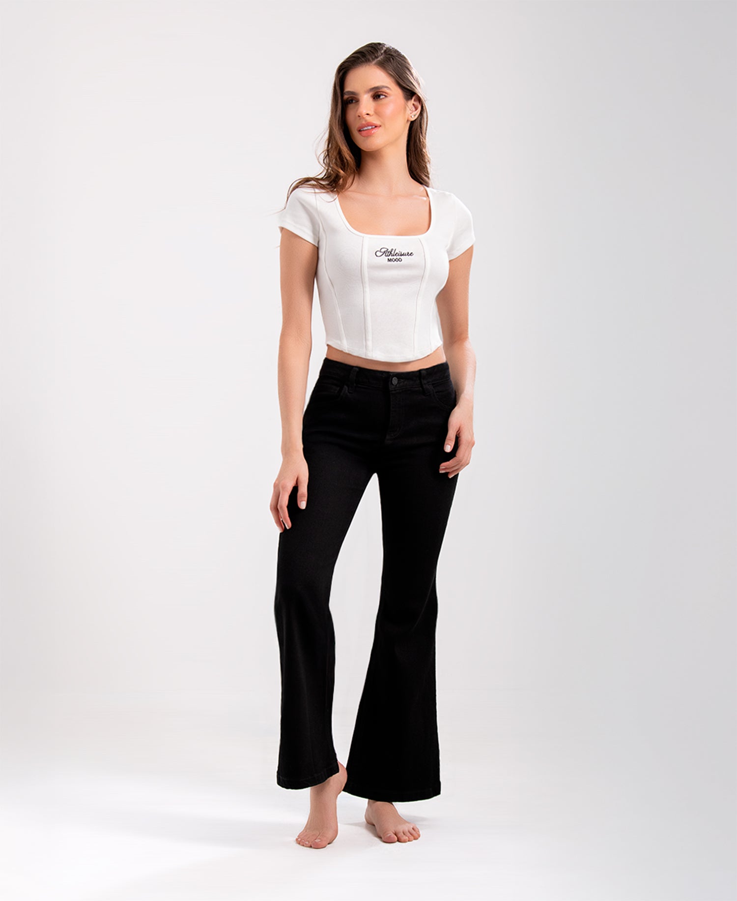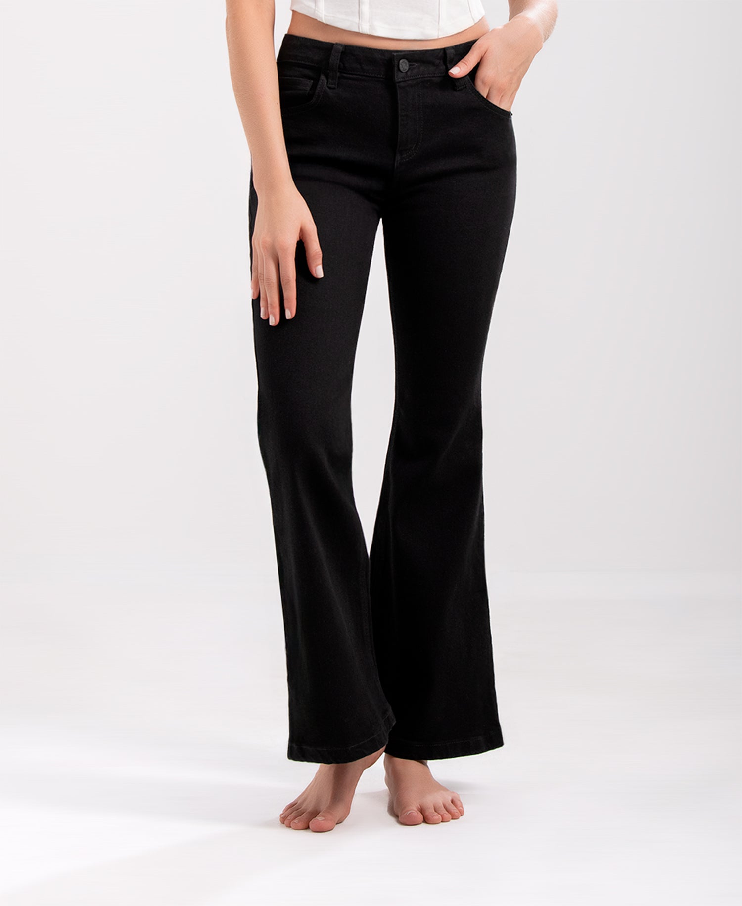 El Jean flare negro combina elegancia y estilo clásico. Su diseño de tiro medio realza la figura, mientras la bota campana aporta equilibrio y un toque retro moderno. Perfecto para crear looks estilizados, con tacones o plataformas que realzan su caída impecable.
