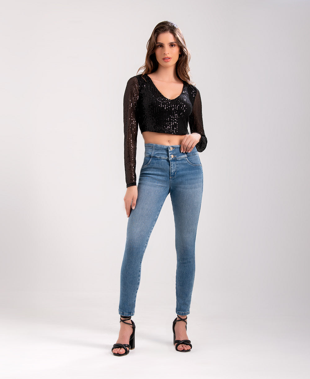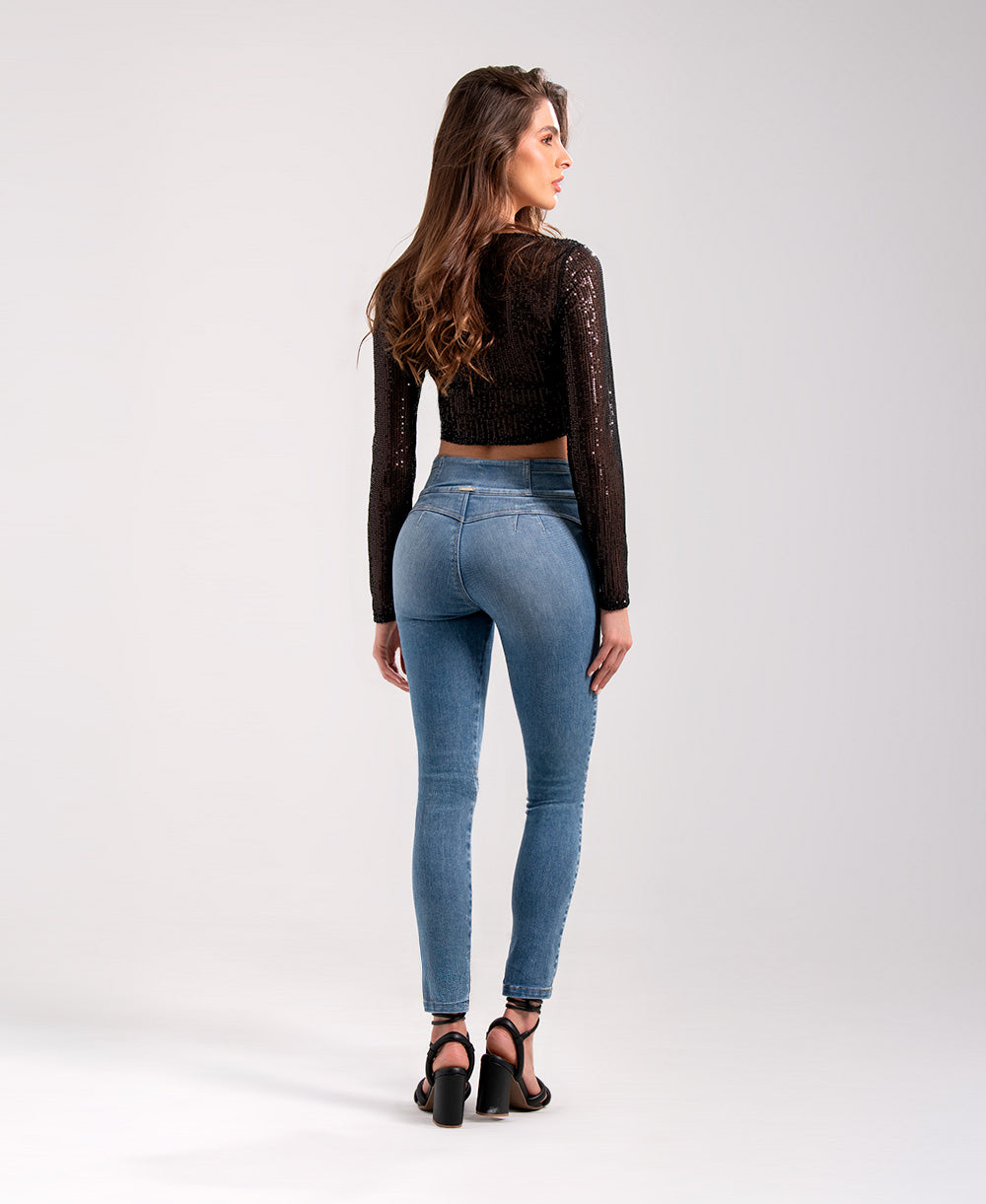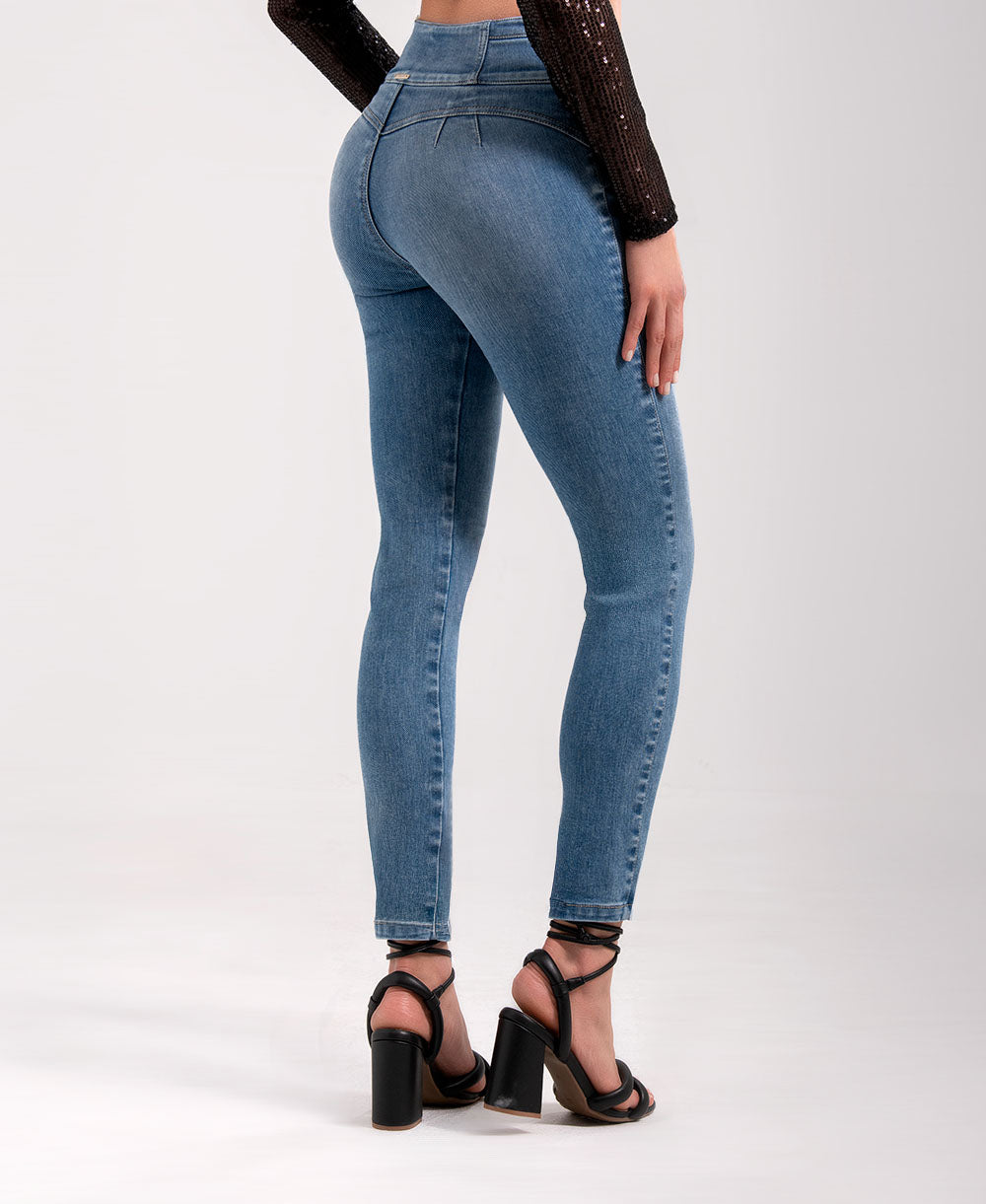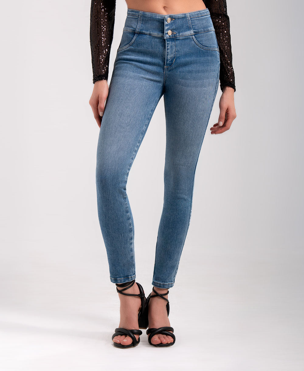 Diseñado para realzar tu figura, este jean de tiro alto con tecnología bottom up moldea y levanta naturalmente. Su ajuste skinny estiliza las piernas mientras los tres botones frontales aportan un detalle moderno y sofisticado. Confeccionado en denim azul claro con suave desgaste, es ideal para crear looks casuales y versátiles que te acompañan todo el día con comodidad y estilo