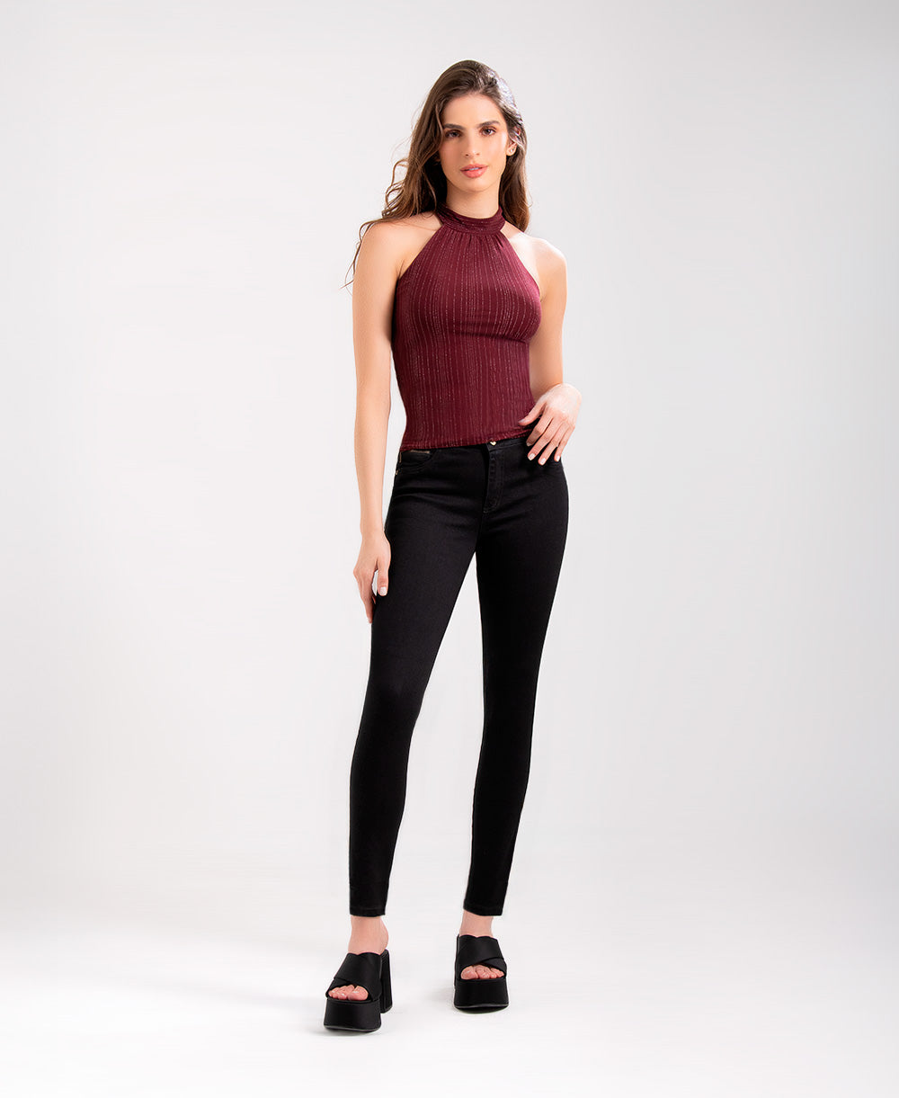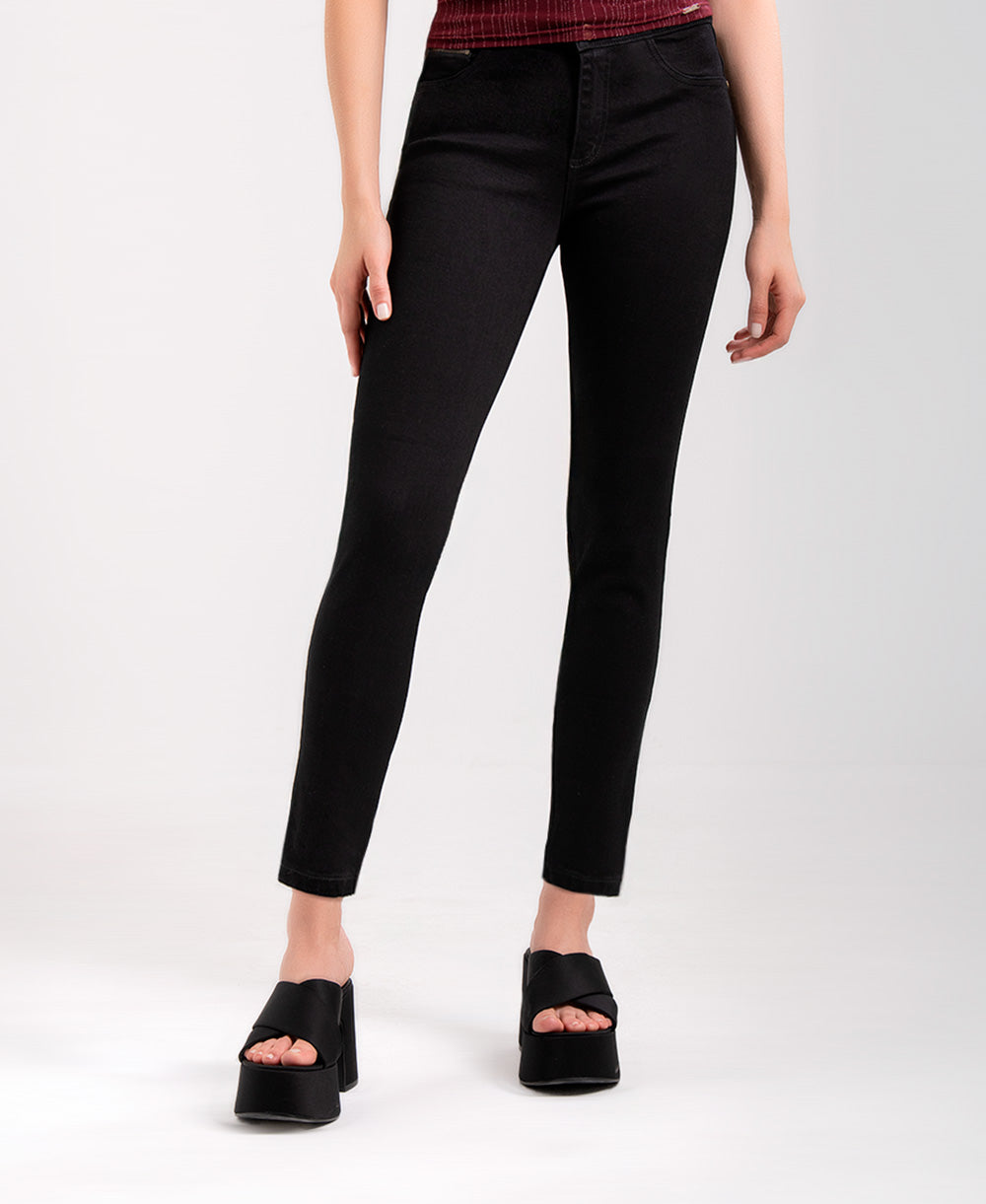 Diseñado para realzar tu figura, este jean de tiro alto con tecnología bottom up moldea y levanta naturalmente. Su ajuste skinny estiliza las piernas mientras los tres botones frontales aportan un detalle moderno y sofisticado. Confeccionado en denim negro, es ideal para crear looks casuales y versátiles