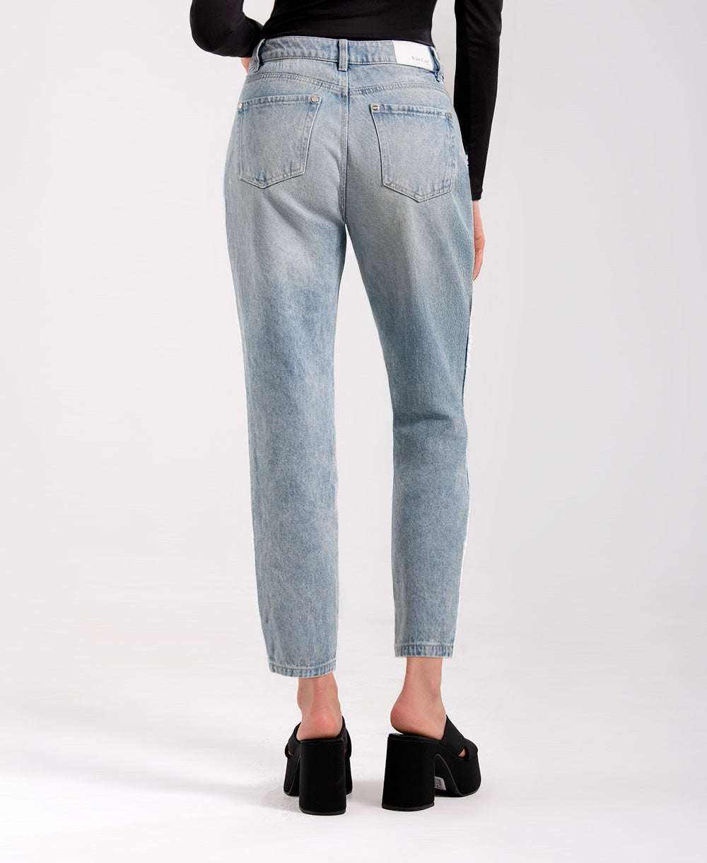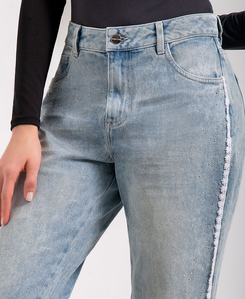 Jean en denim azul claro con efecto desgastado suave y aplicaciones de brillo sutil a lo largo de las piernas. Su silueta recta y fit relajado estiliza la figura mientras ofrece comodidad para el día a día. Un básico con un toque glam ideal para elevar looks casuales sin esfuerzo. Perfecto para combinar con tops, camisas o piezas más sofisticadas