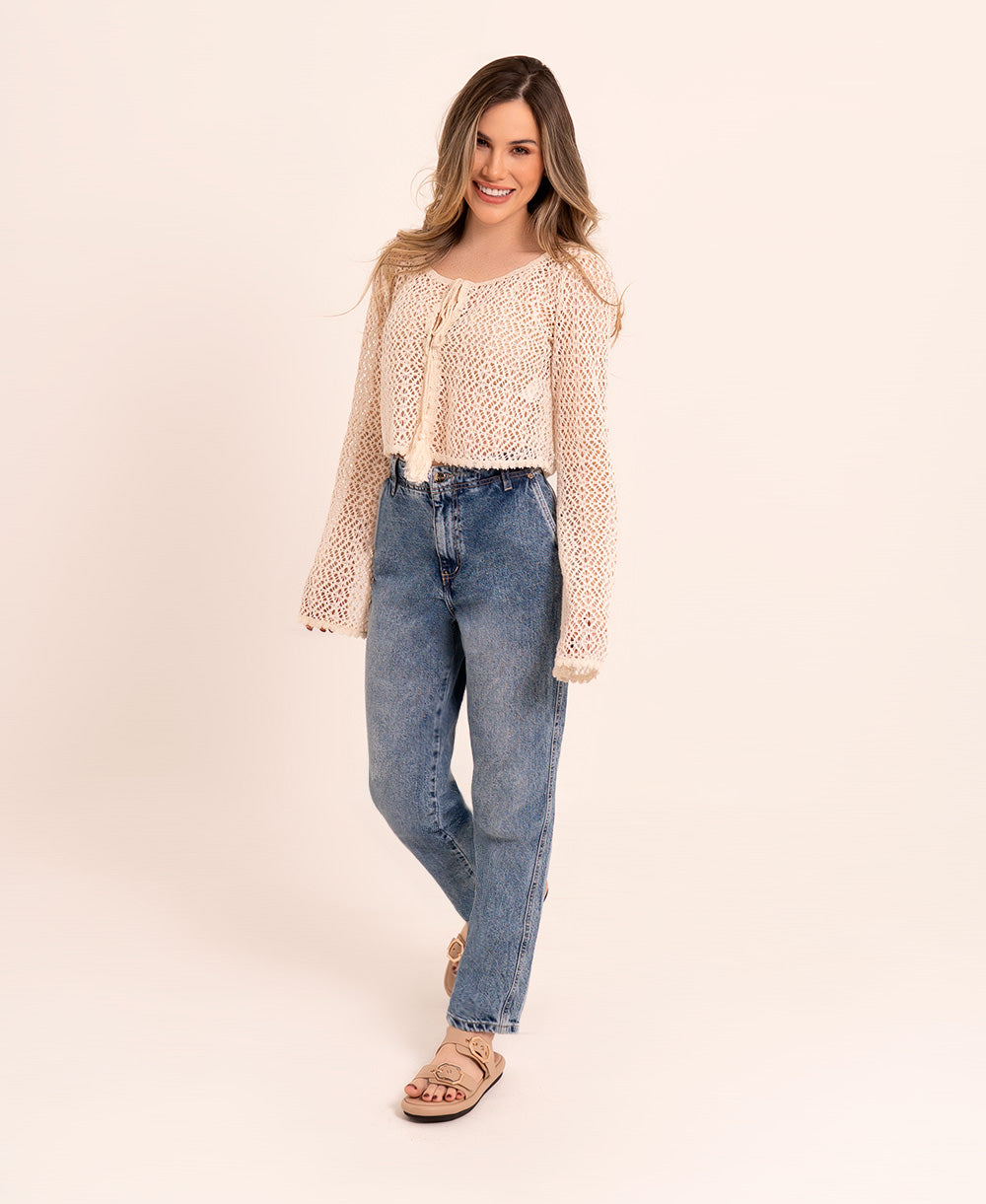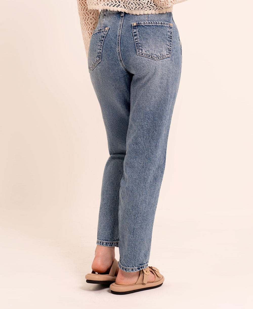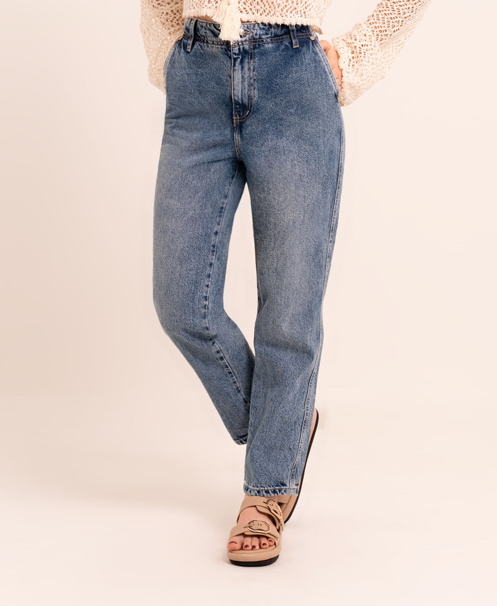 Jean de tiro alto con silueta mom fit, perfecto para lograr un look relajado y cómodo sin perder elegancia. Su diseño clásico en denim azul y ajuste en la cintura realza la figura, mientras que la pernera recta aporta versatilidad para combinar con tenis, sandalias o tacones. Ideal para outfits casuales y trendy.