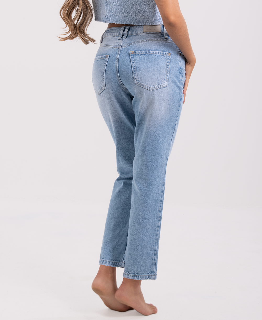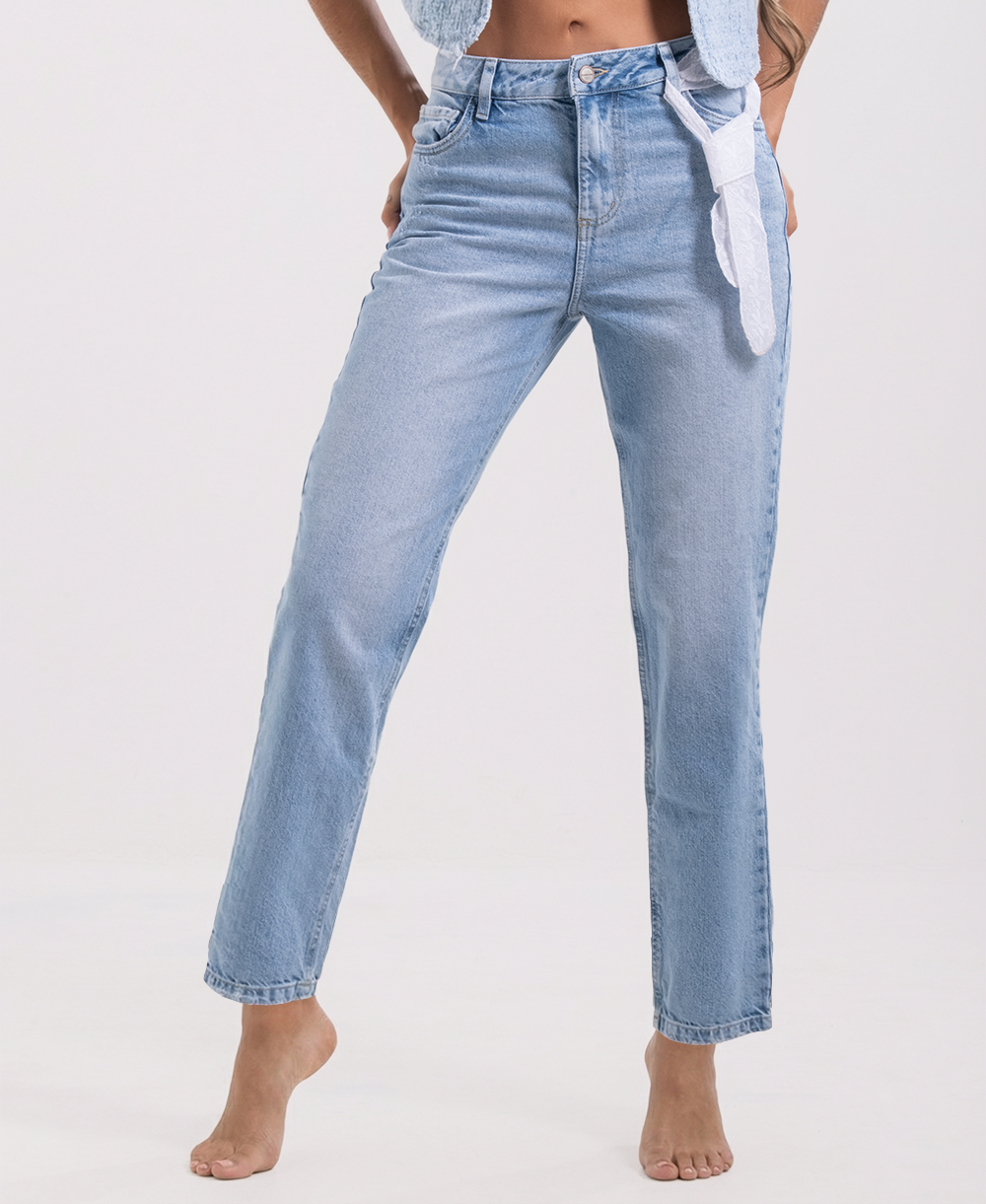 Jean mom fit de tiro alto en denim azul claro que realza la cintura y brinda un calce cómodo y favorecedor. Presenta una silueta relajada en cadera y muslos, con pierna recta y caída natural. Incorpora un lazo decorativo en la pretina, que aporta un detalle femenino y moderno sin afectar el ajuste. Una prenda versátil y atemporal, ideal para combinar con tops, blusas o camisetas y crear looks casuales con estilo.