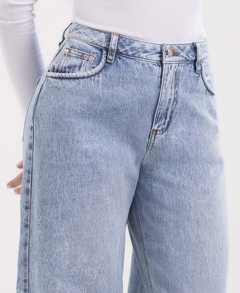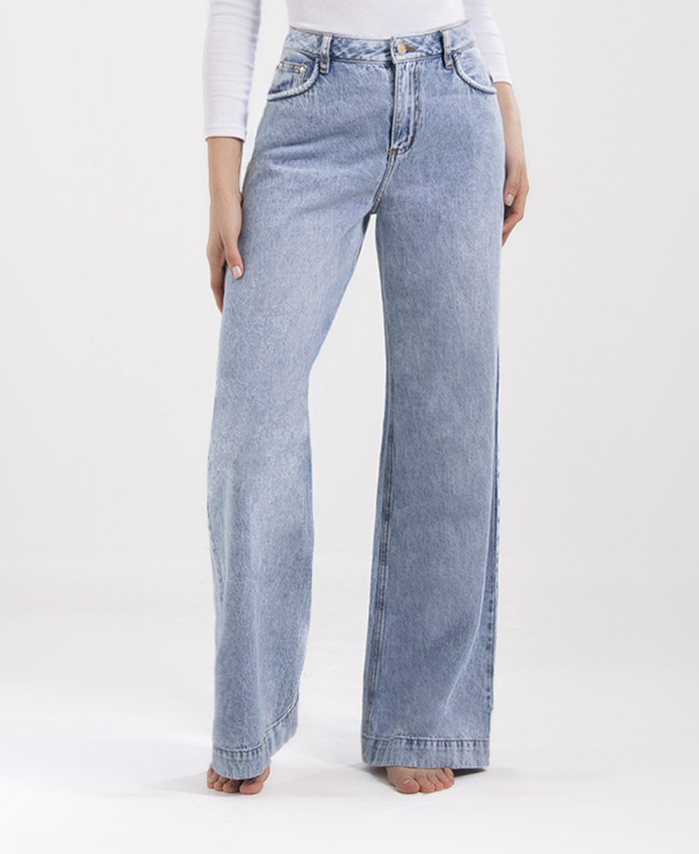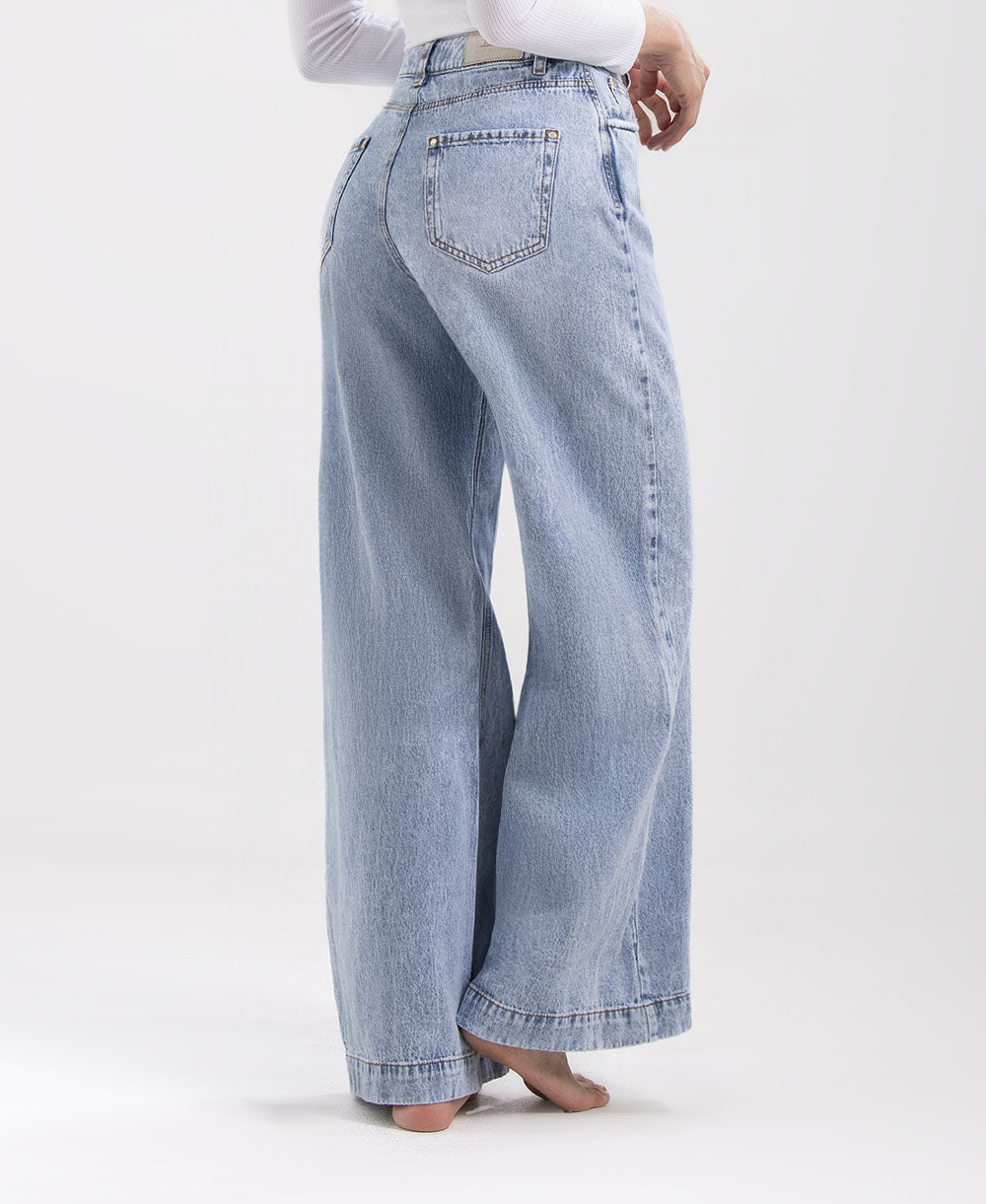 Jean tipo palazzo de tiro alto, confeccionado en denim azul claro con lavado uniforme que aporta un look fresco y atemporal. Su silueta amplia desde la cadera hasta el ruedo estiliza la figura y brinda máxima comodidad. Cuenta con diseño clásico de cinco bolsillos, pretina con pasadores, cierre con cremallera y botón metálico. Ideal para crear outfits versátiles que van desde lo casual hasta lo sofisticado, combinando fácilmente con tops ajustados, blusas o bodys.