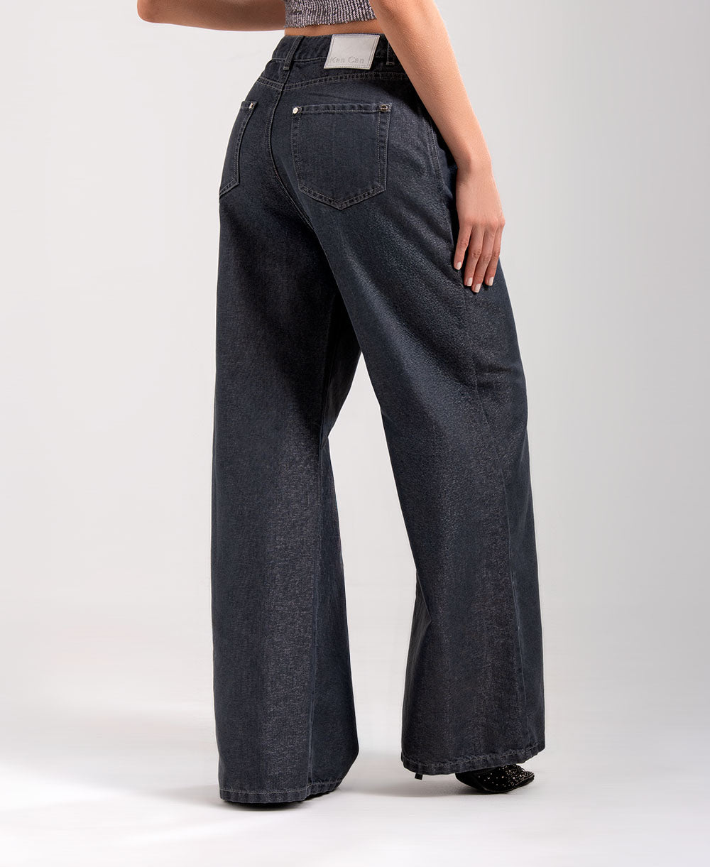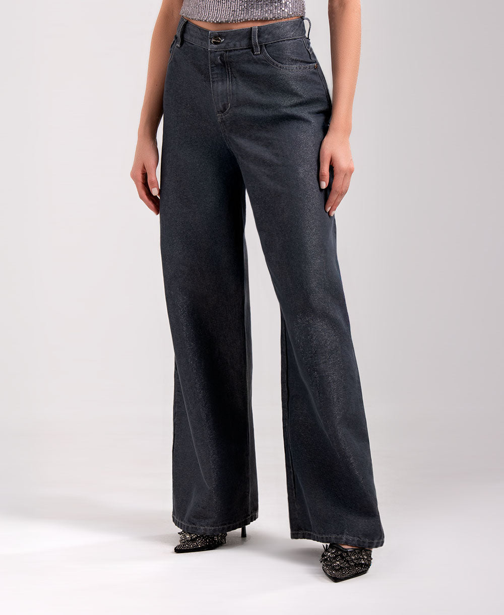 Jean estilo palazzo ofrece una silueta amplia y moderna. Presenta bolsillos funcionales y cierre frontal con botón metálico. El tejido incorpora un acabado brillante o efecto satinado, que aporta un sutil destello sobre la superficie del jean, elevando la prenda y dándole un toque sofisticado. Ideal para combinar looks casuales con un giro elegante o para outfits nocturnos que buscan destacar sin perder comodidad.