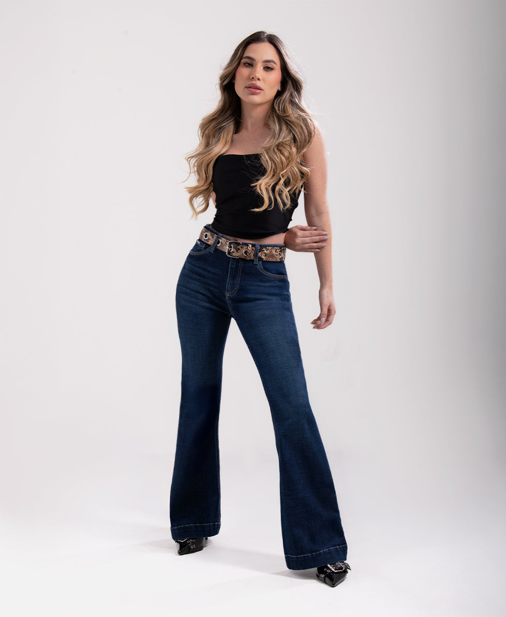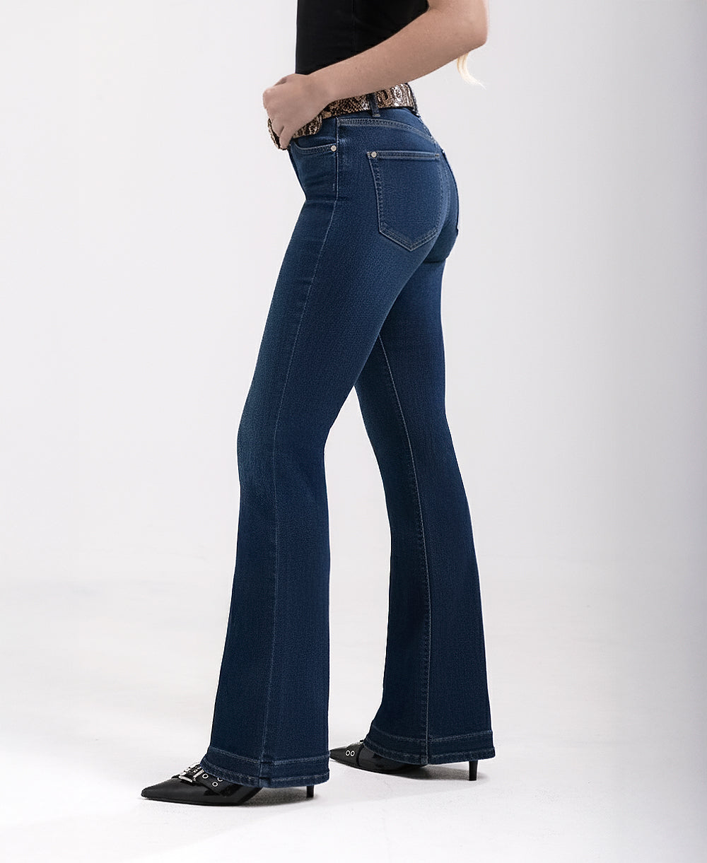 Nuestro jean semicampana tiro alto en tono azul estiliza tu figura con su silueta ajustada en cadera y muslos que se abre sutilmente a partir de la rodilla. Su color profundo genera un efecto visual que alarga y afina las piernas, haciendo de este jean una prenda ideal para looks elegantes o casuales. Fabricado en denim con stretch inteligente, ofrece comodidad, control y una horma perfecta todo el día. Combínalo con blusas ajustadas o bodys