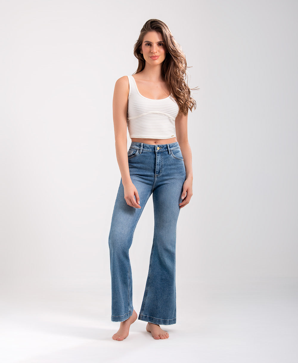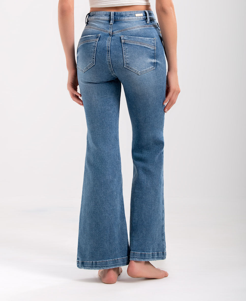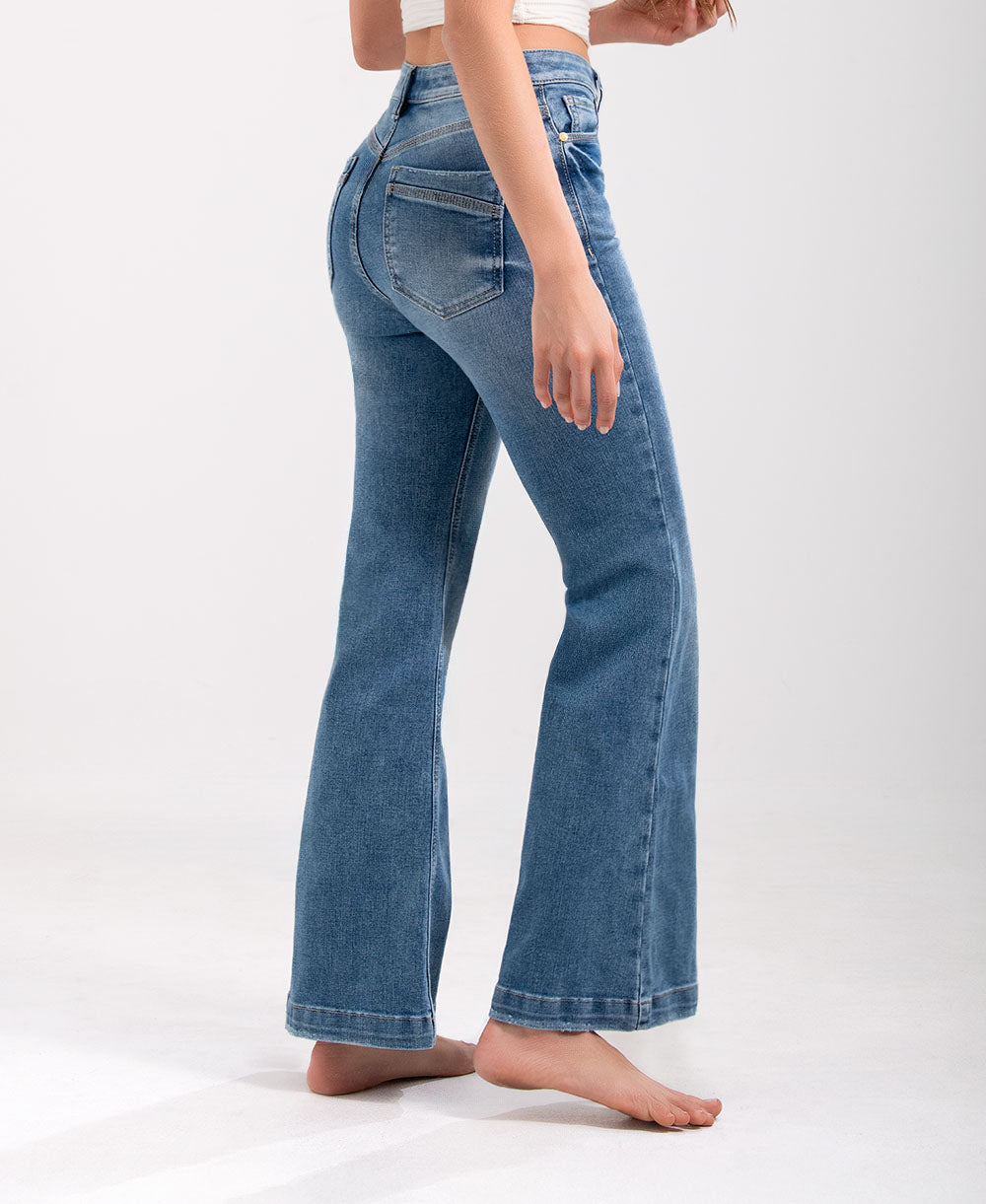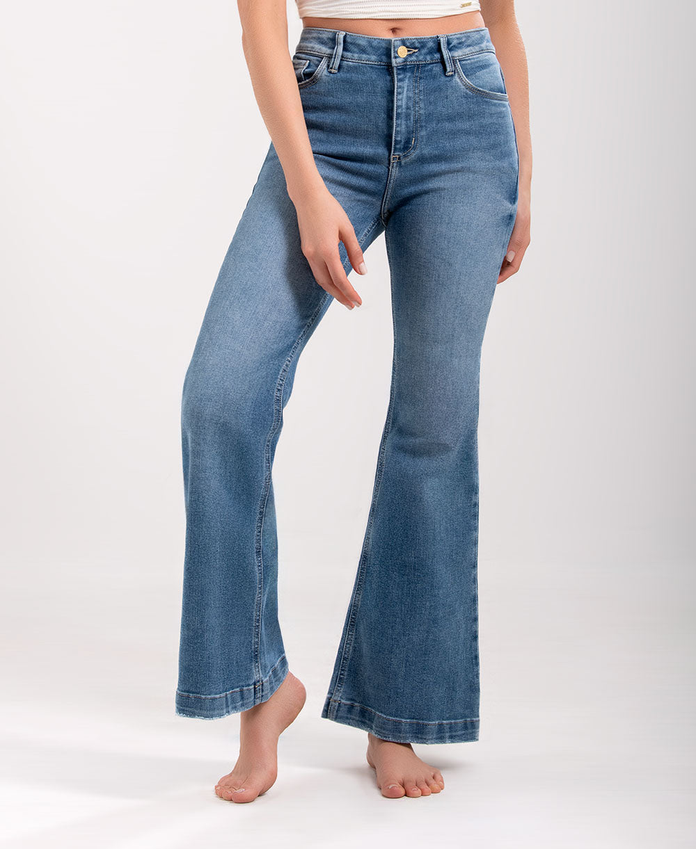 Este jean semicampana está diseñado para estilizar tu figura con un fit moderno y cómodo. Su tiro alto define la cintura y aporta un efecto moldeado, mientras que el bota semiancha desde la rodilla alarga visualmente las piernas, creando un look equilibrado y muy favorecedor.