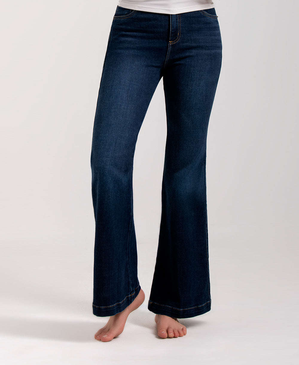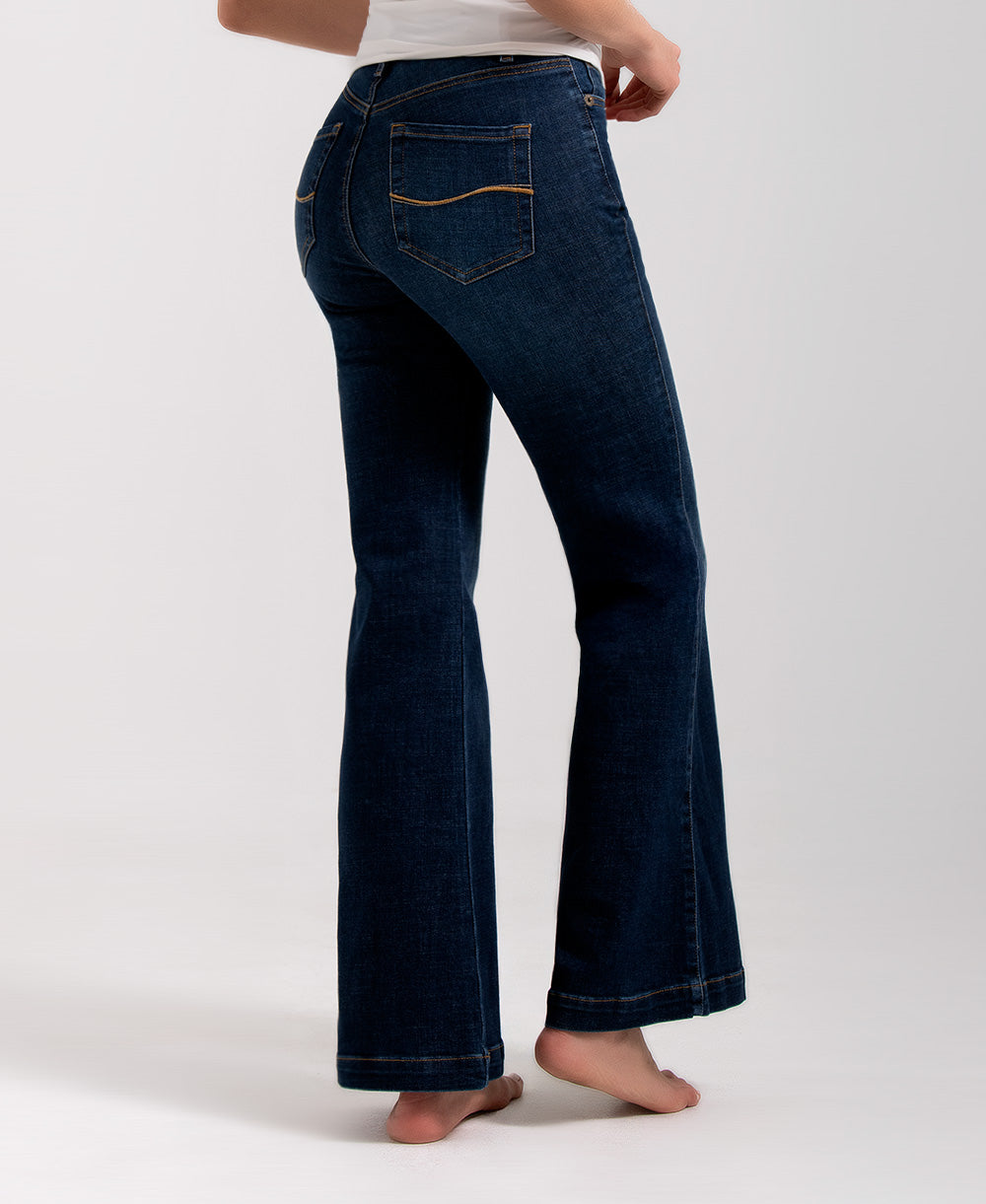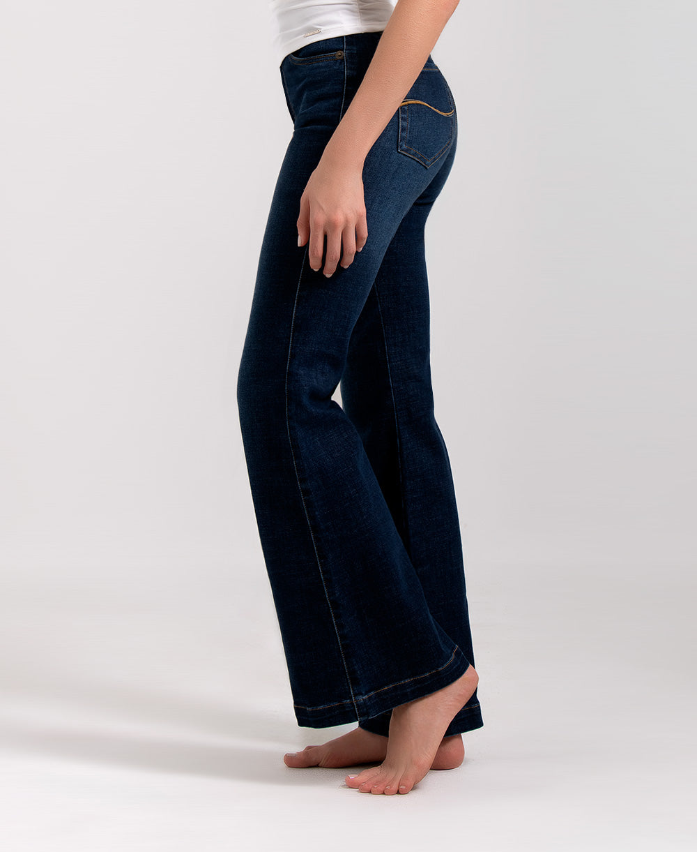 Jean semicampana elaborado en denim azul oscuro. Su diseño de tiro alto realza la figura, mientras que el corte ajustado en la cadera y ligeramente ampliado en la bota aporta un efecto alargador y muy favorecedor. Cuenta con bolsillos funcionales con bordado posterior y cierre frontal con botón metálico. Ideal para crear looks modernos con un aire elegante y versátil.