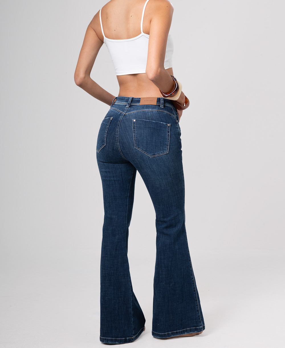Jean en denim azul oscuro con silueta semicampana, ajustado en cadera y muslo y con ligera apertura desde la rodilla hacia el ruedo. Diseño de tiro alto con bolsillos funcionales, cierre frontal con cremallera y botón metálico. Presenta lavado con sutil desgaste frontal que estiliza la figura y aporta profundidad al color. Ideal para looks casuales o elevaciones más sofisticadas combinándolo con tacones o plataformas.