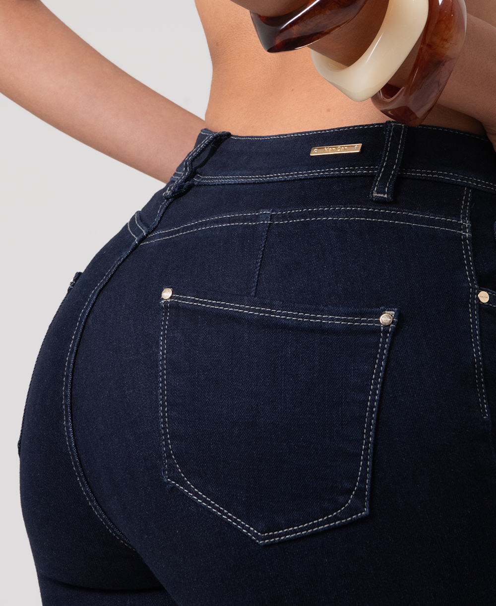 Jean en denim azul oscuro de silueta skinny, ajustado desde la cadera hasta el tobillo para un fit ceñido y estilizado. Diseño de tiro alto con bolsillos funcionales y cierre frontal con cremallera y botón metálico. Incorpora detalle de herraje decorativo tipo argolla en el bolsillo delantero, aportando un toque moderno y distintivo. Confeccionado en denim con ligera elasticidad para mayor comodidad y ajuste al cuerpo.
