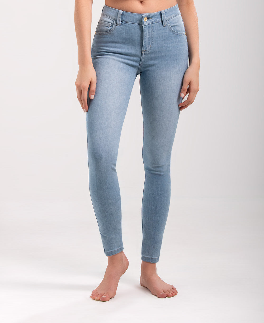 Nuestro jean skinny en tono azul claro es el básico imprescindible que acompaña todos tus looks, desde casuales hasta más chic. Su diseño de tiro medio estiliza la figura, moldea la cintura y realza tus curvas sin perder comodidad. Fabricado en denim con alto poder de estiramiento, abraza el cuerpo y mantiene su forma durante todo el día..