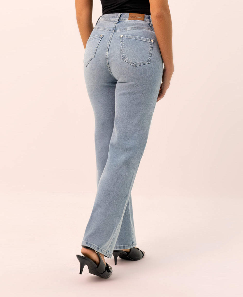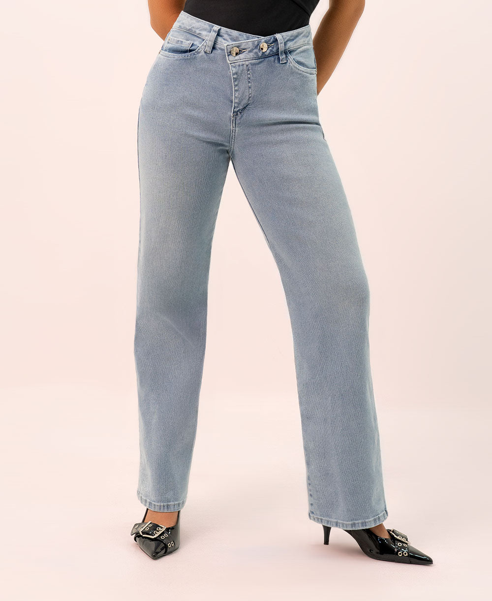 Jean Straight cintura cruzada claro. Su corte straight ofrece una silueta recta desde la cadera hasta el bajo, logrando un look moderno y favorecedor. Con tiro medio que define la cintura y un denim suave que se ajusta al cuerpo sin perder su forma. Ideal para crear outfits versátiles, desde los más casuales hasta los más chic.