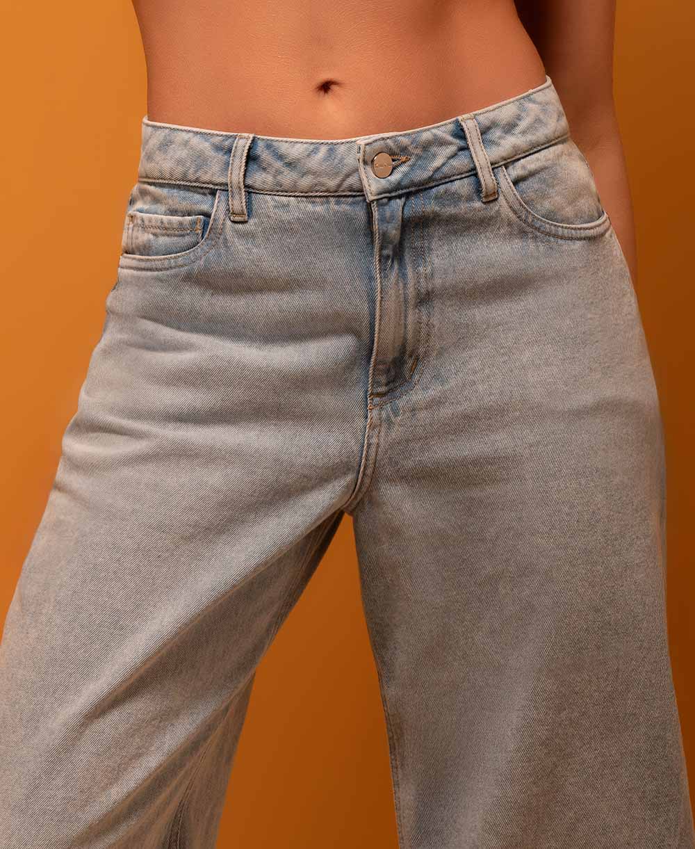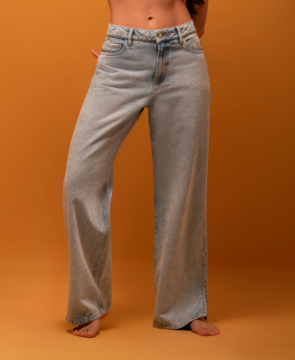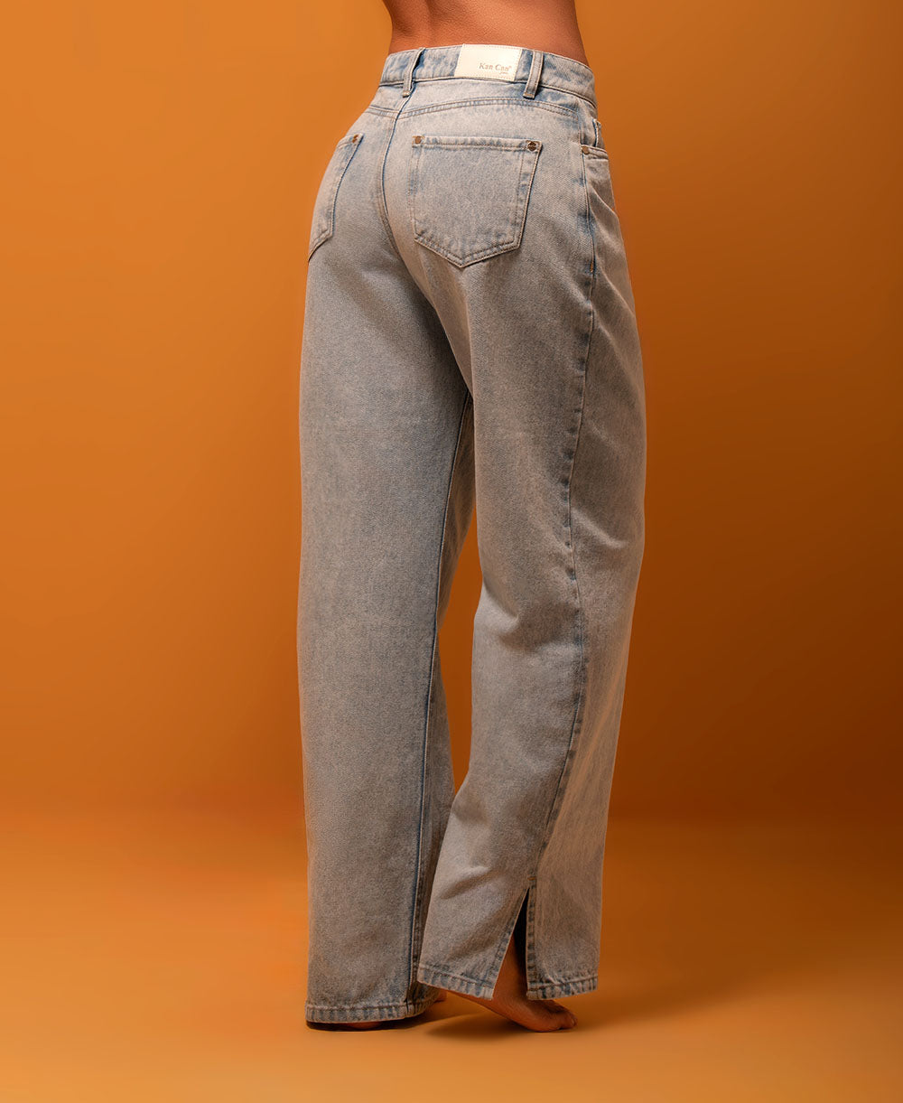 Jean Straight tiro alto en denim azul claro, que aporta frescura y comodidad. Incluye aberturas discretas en los bajos para un toque moderno y versátil, perfecto para elevar looks casuales con estilo actual