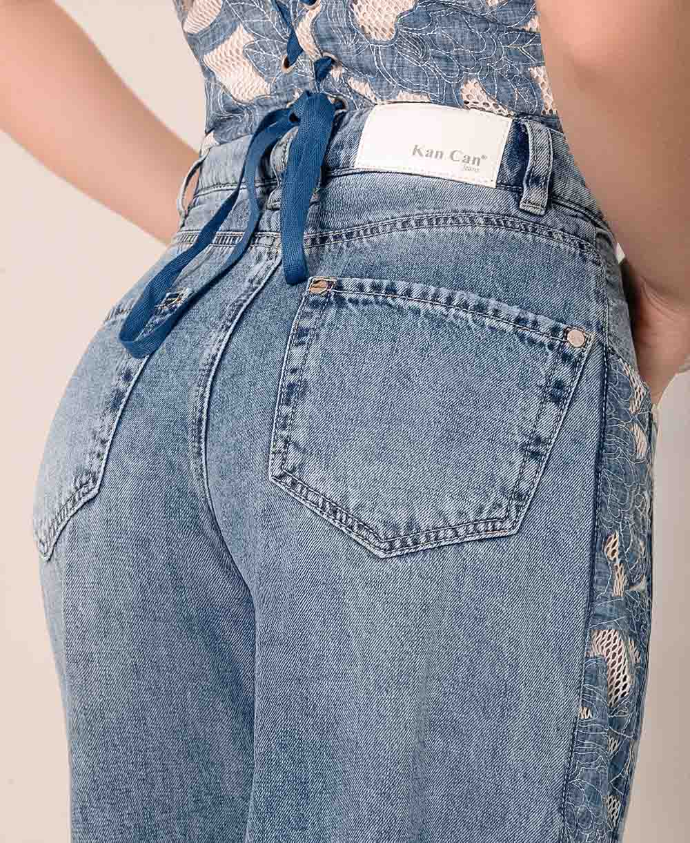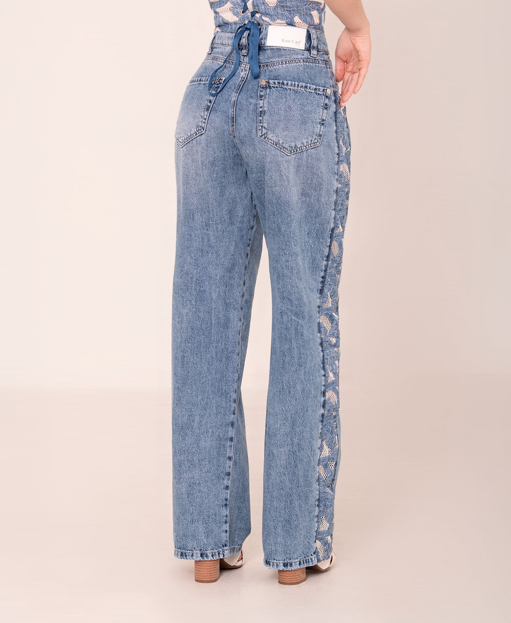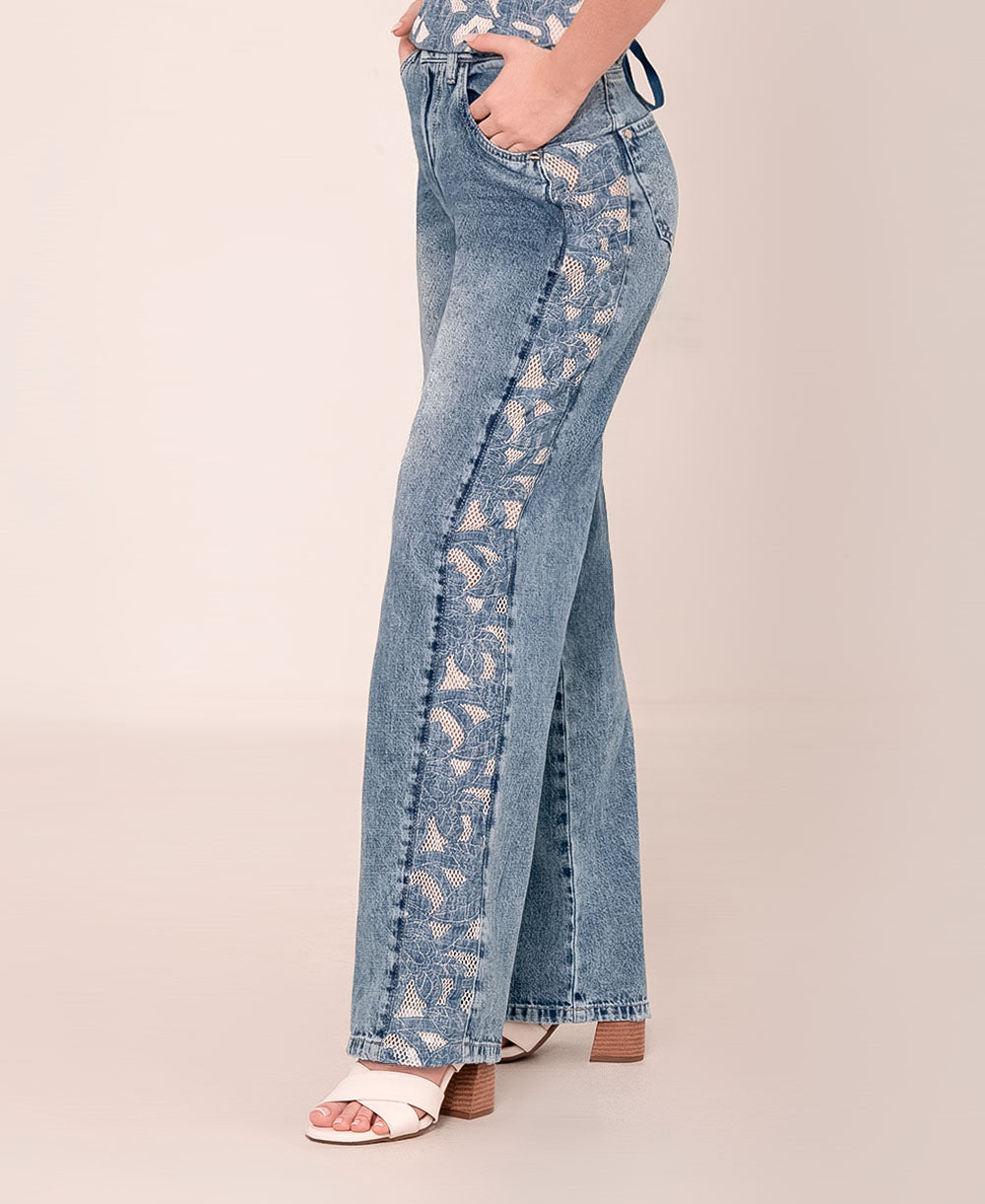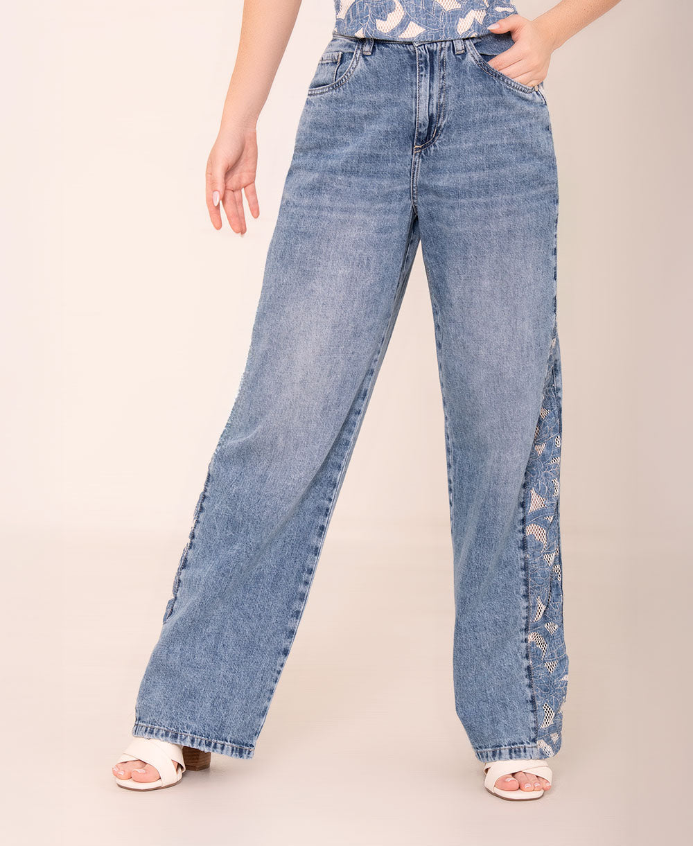 Jean Straight denim azul medio con diseño lateral en encaje floral que aporta un contraste único y femenino. De tiro alto y silueta relajada, combina comodidad con un estilo sofisticado y moderno. Perfecto para elevar looks casuales con un detalle distintivo que lo hace destacar
